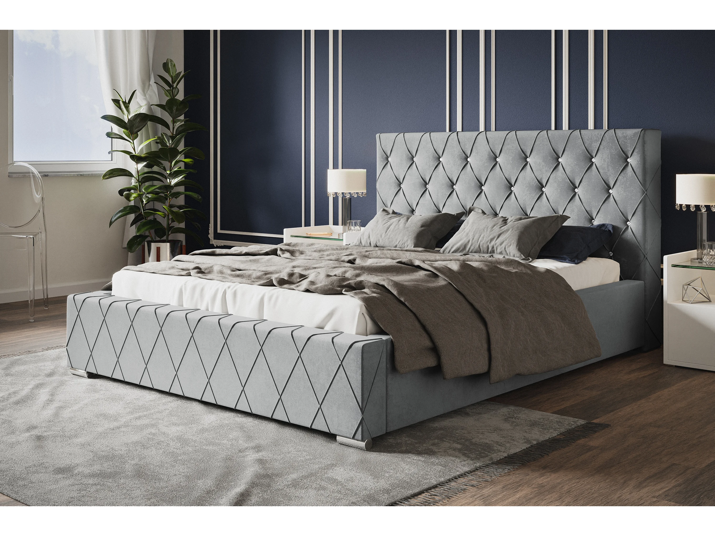 Lit rembourré Berlin avec tête de lit, 140x200 cm, avec coffre de rangement et sommier à lattes en bois, tissu velours, couleur: gris