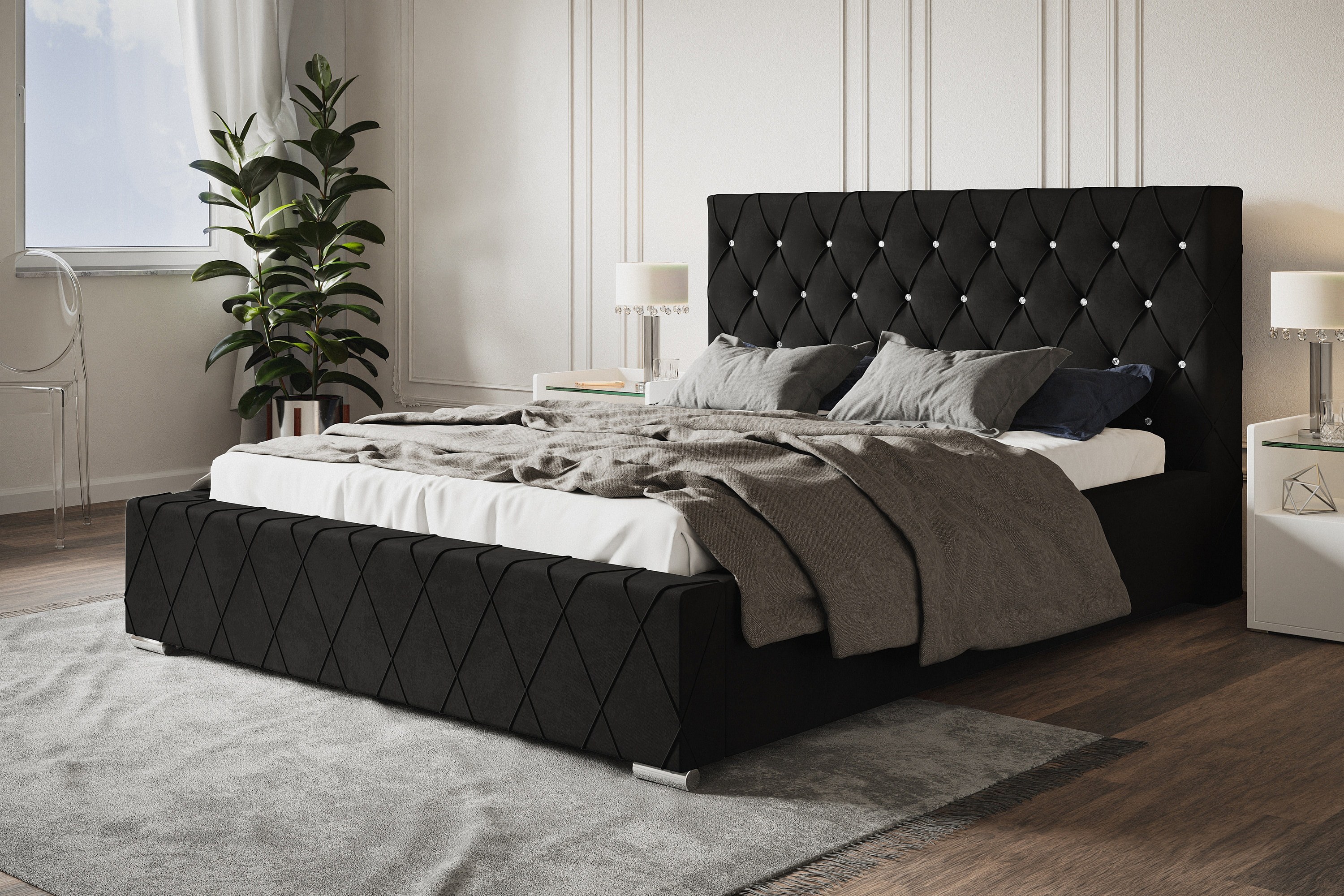 Lit rembourré Berlin avec tête de lit, 140x200 cm, lit double avec coffre de rangement et sommier à lattes en bois, tissu velours, couleur : noir