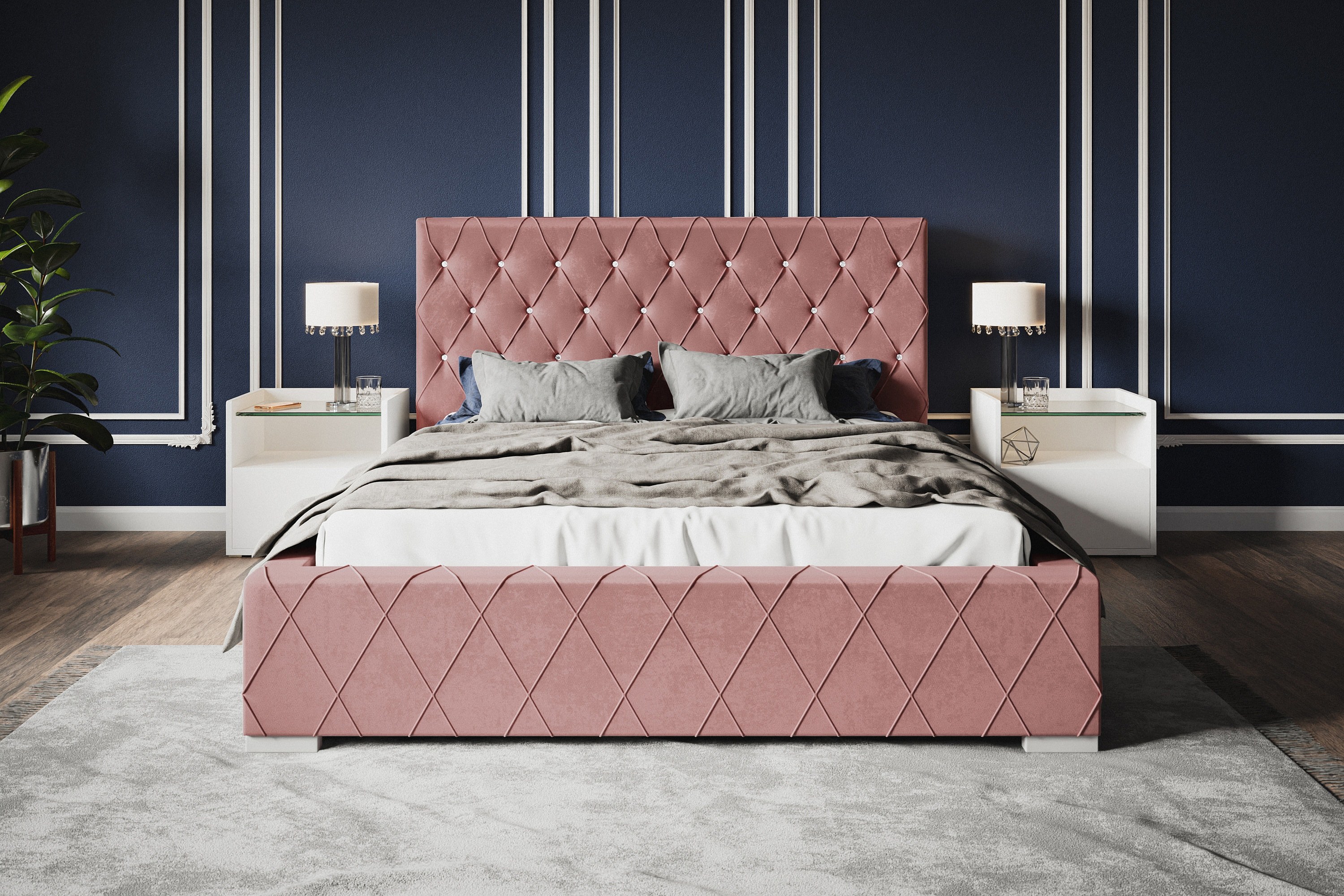 Lit rembourré Berlin avec tête de lit, 140x200 cm, lit double avec coffre de rangement et sommier à lattes en bois, tissu velours, couleur : rose