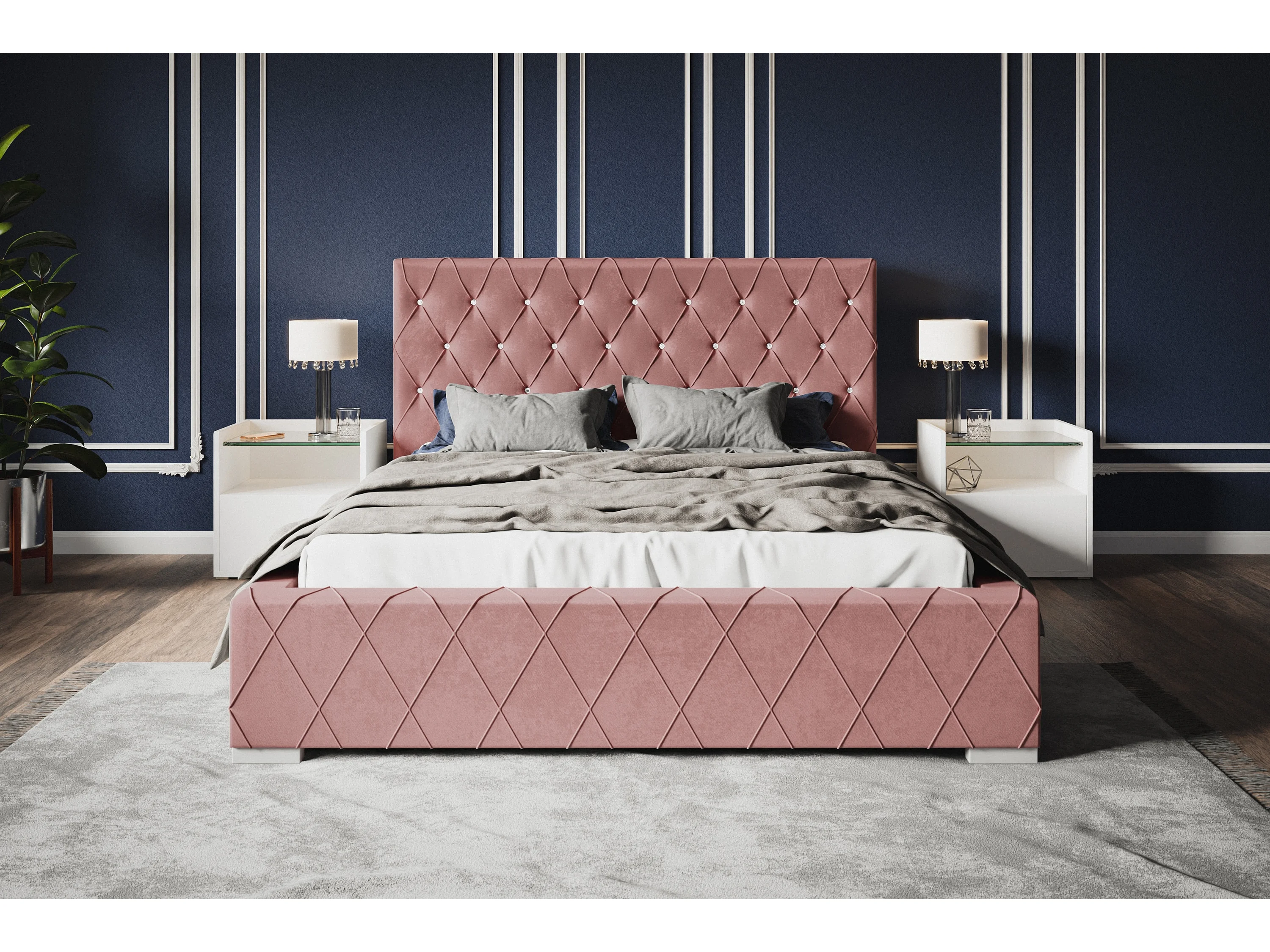 Lit rembourré Berlin avec tête de lit, 140x200 cm, avec coffre de rangement et sommier à lattes en bois, tissu velours, couleur: rose