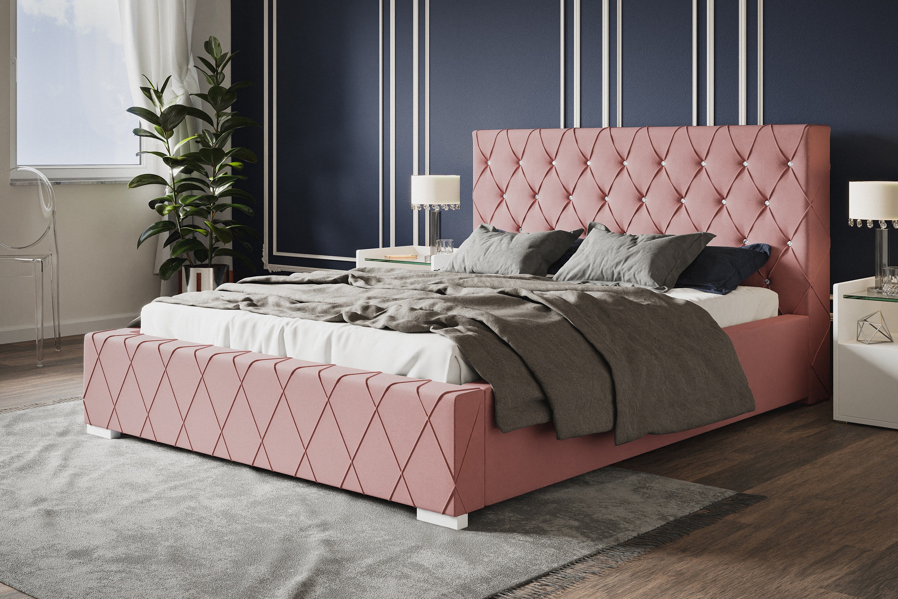 Lit rembourré Berlin avec tête de lit, 160 x 200 cm, lit double avec coffre de rangement et sommier à lattes en bois, tissu velours, couleur : rose