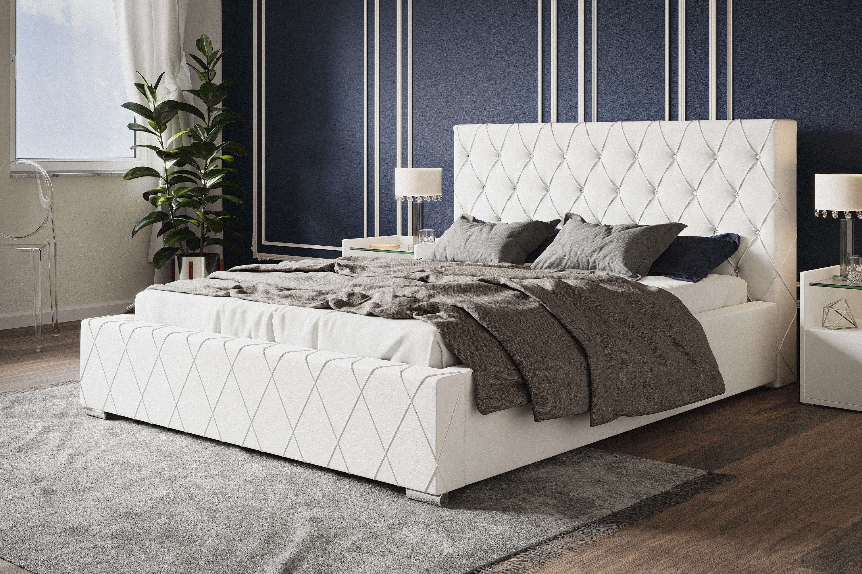 Lit rembourré Berlin avec tête de lit, 180x200 cm, lit double avec coffre de rangement et sommier à lattes en bois, similicuir, couleur : blanc