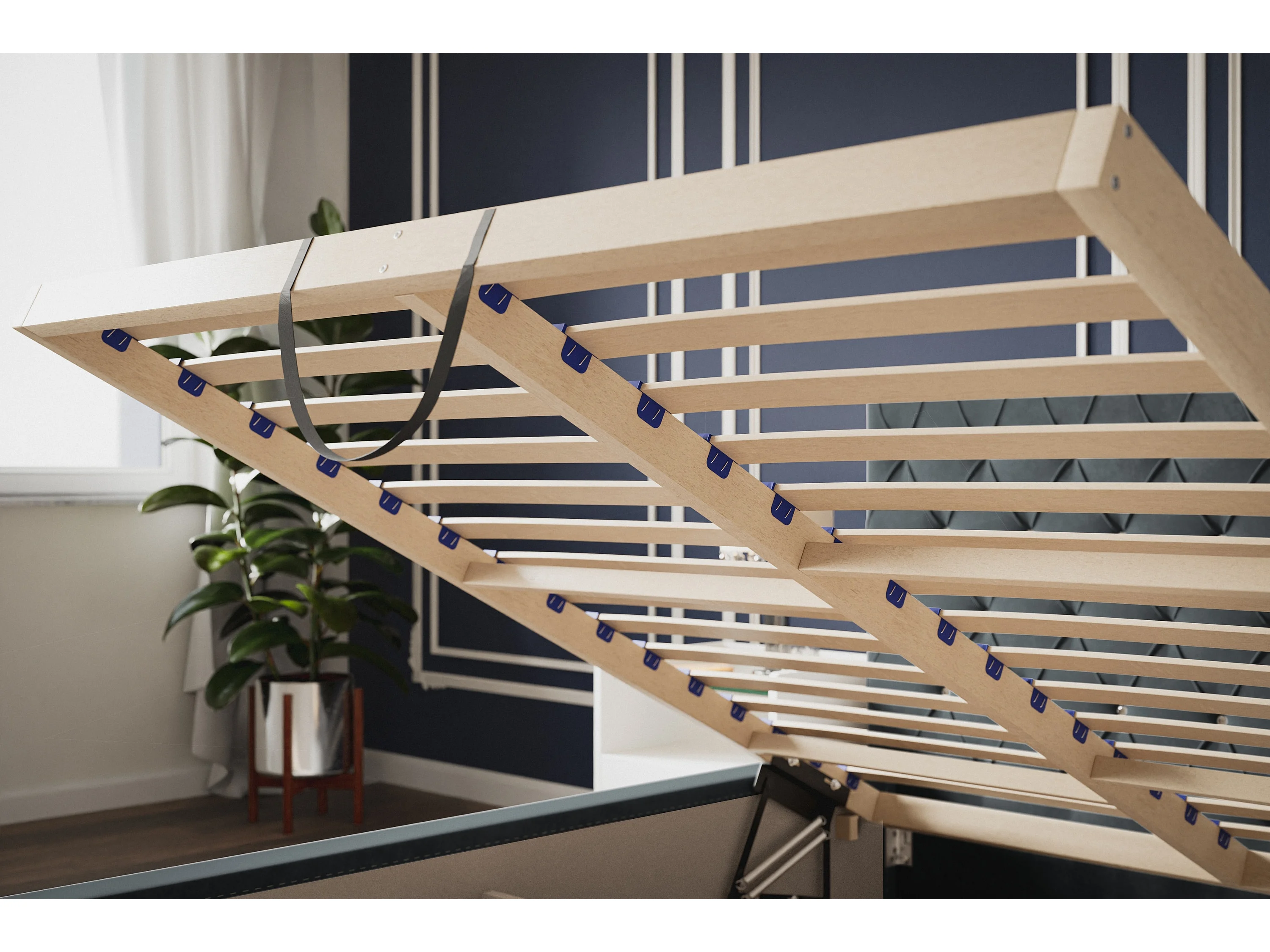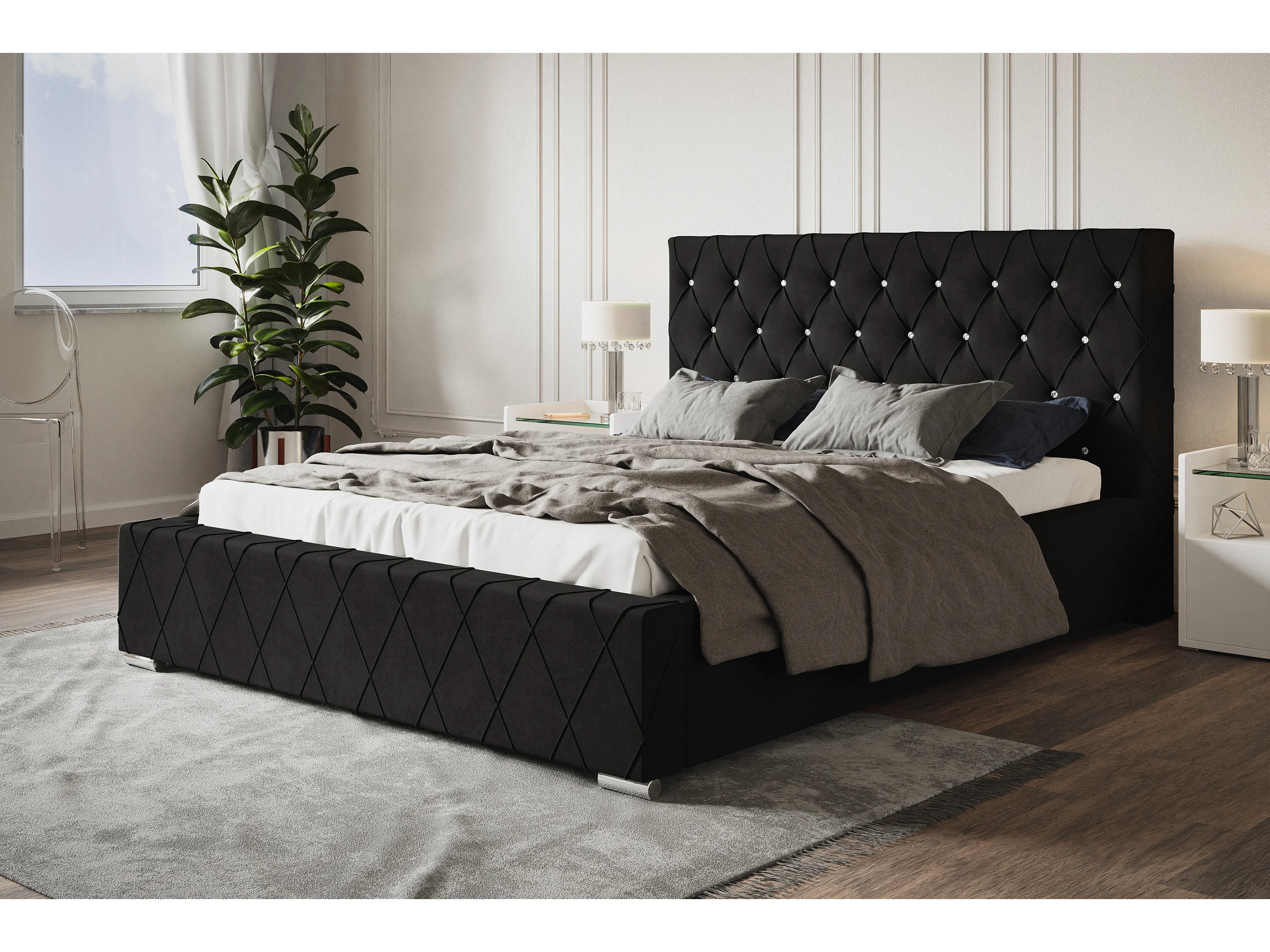 Lit rembourré Berlin avec tête de lit, 180x200 cm, avec coffre de rangement et sommier à lattes en bois, tissu velours, couleur: noir