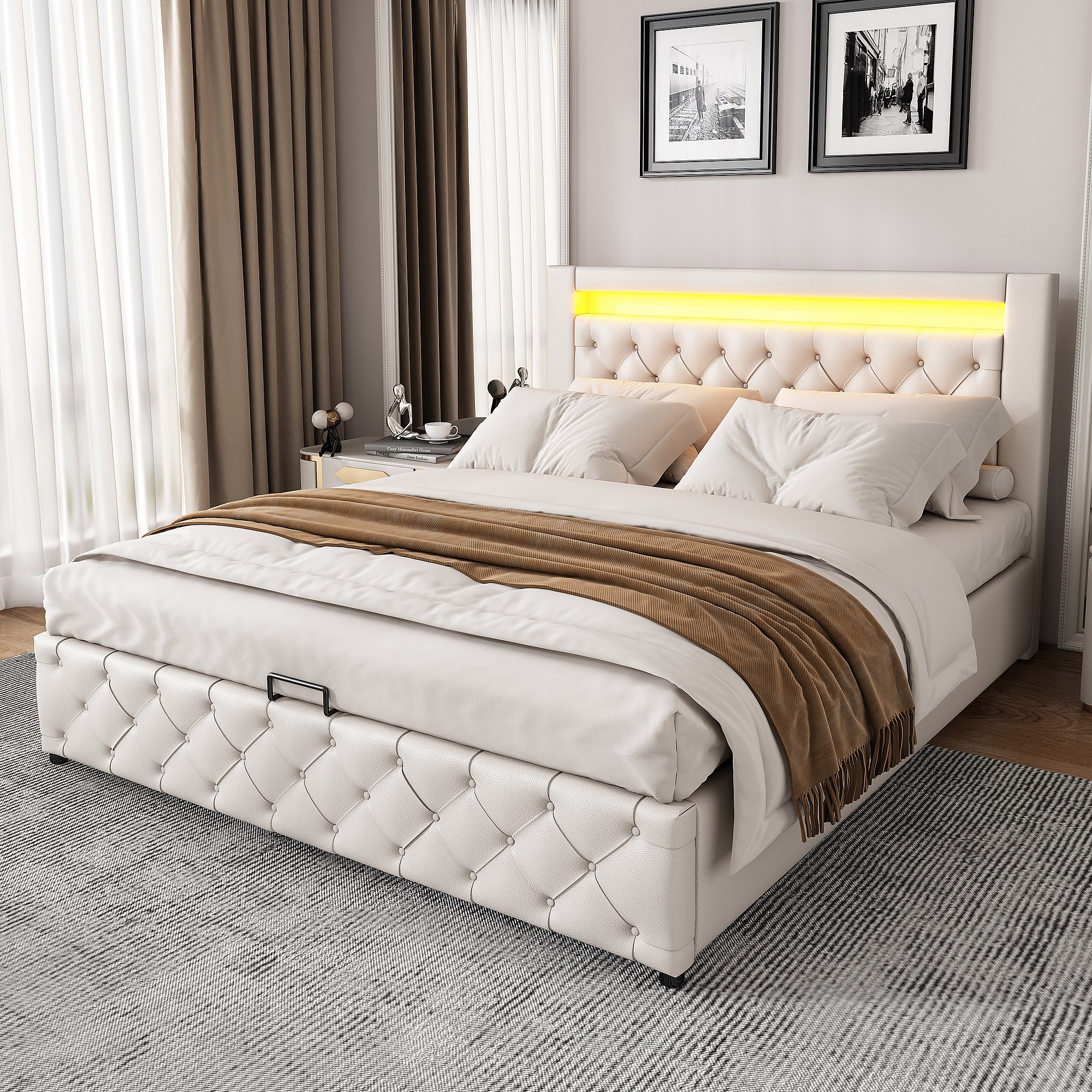 Lit rembourré blanc 140x200 cm avec sommier à lattes, rangement et éclairage LED, design fonctionnel