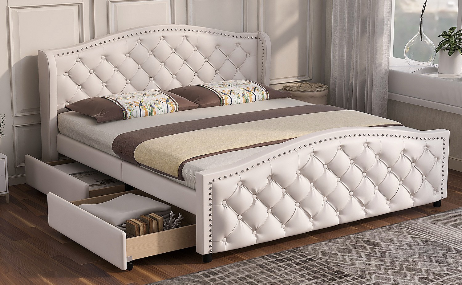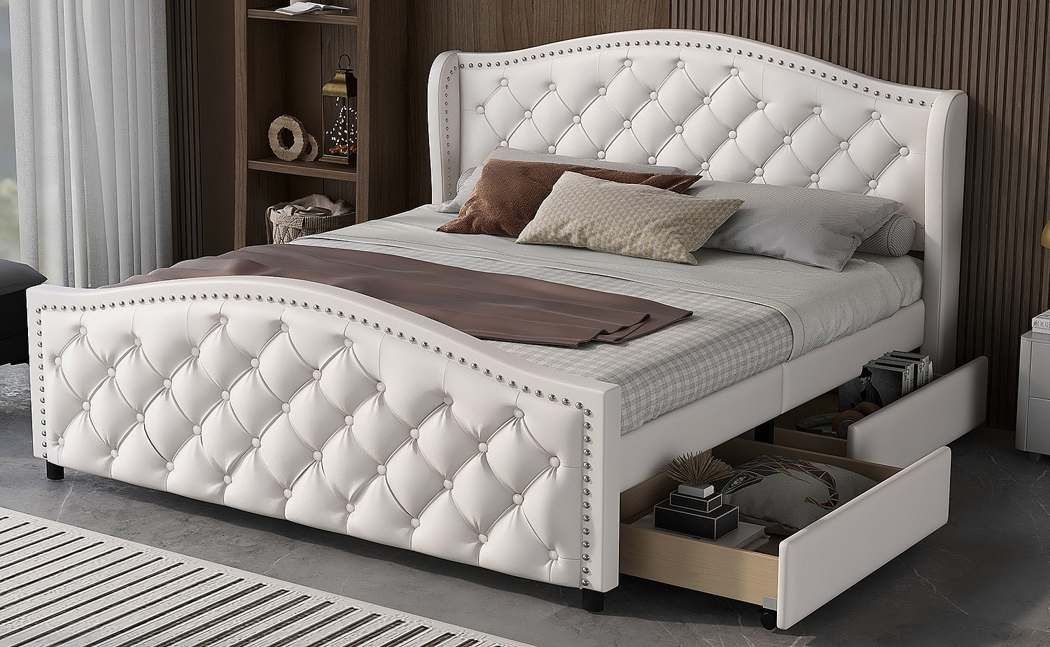 Lit rembourré blanc 160x200 cm avec sommier à lattes, 2 tiroirs et tête de lit, confort pratique et chic