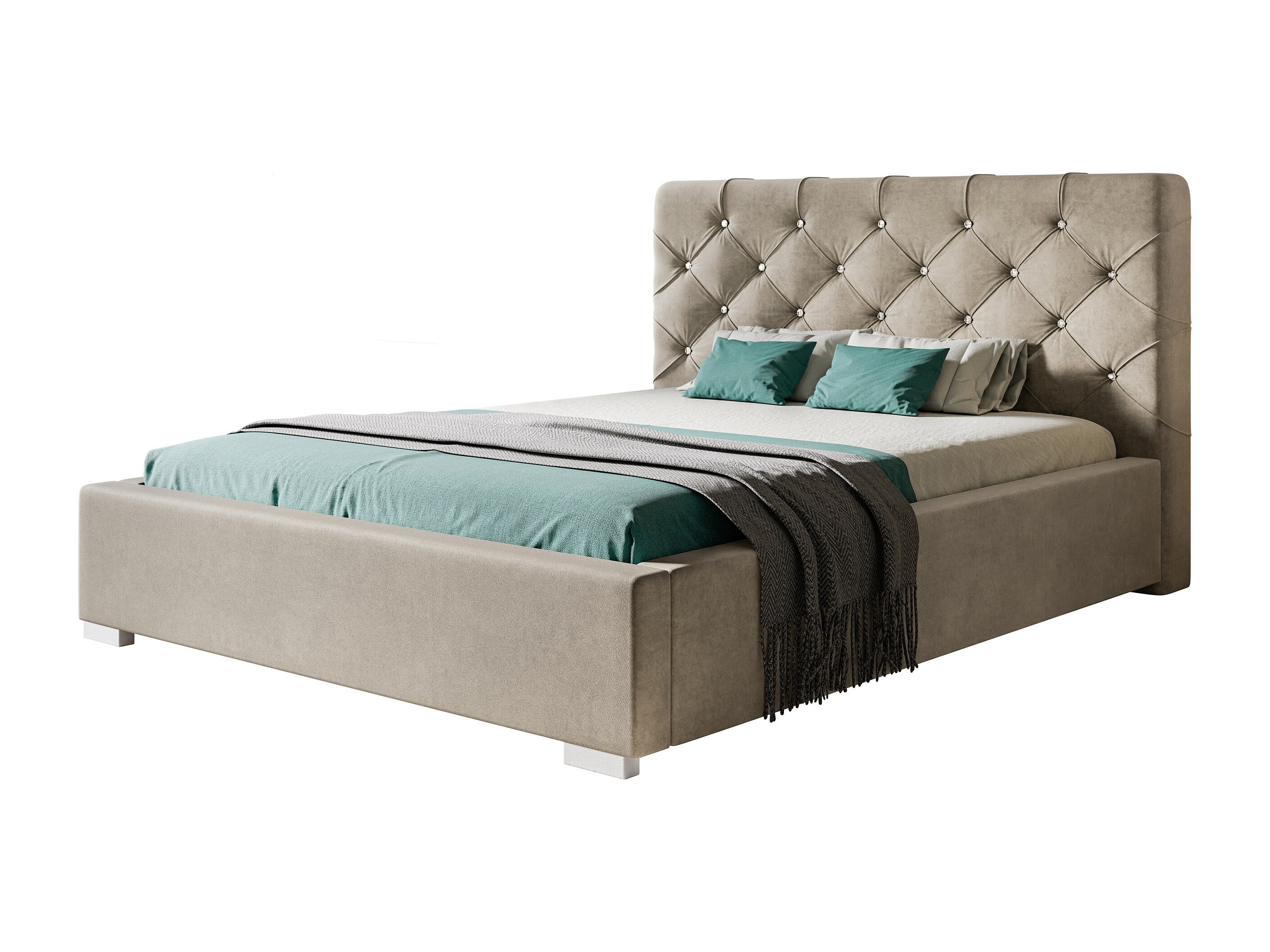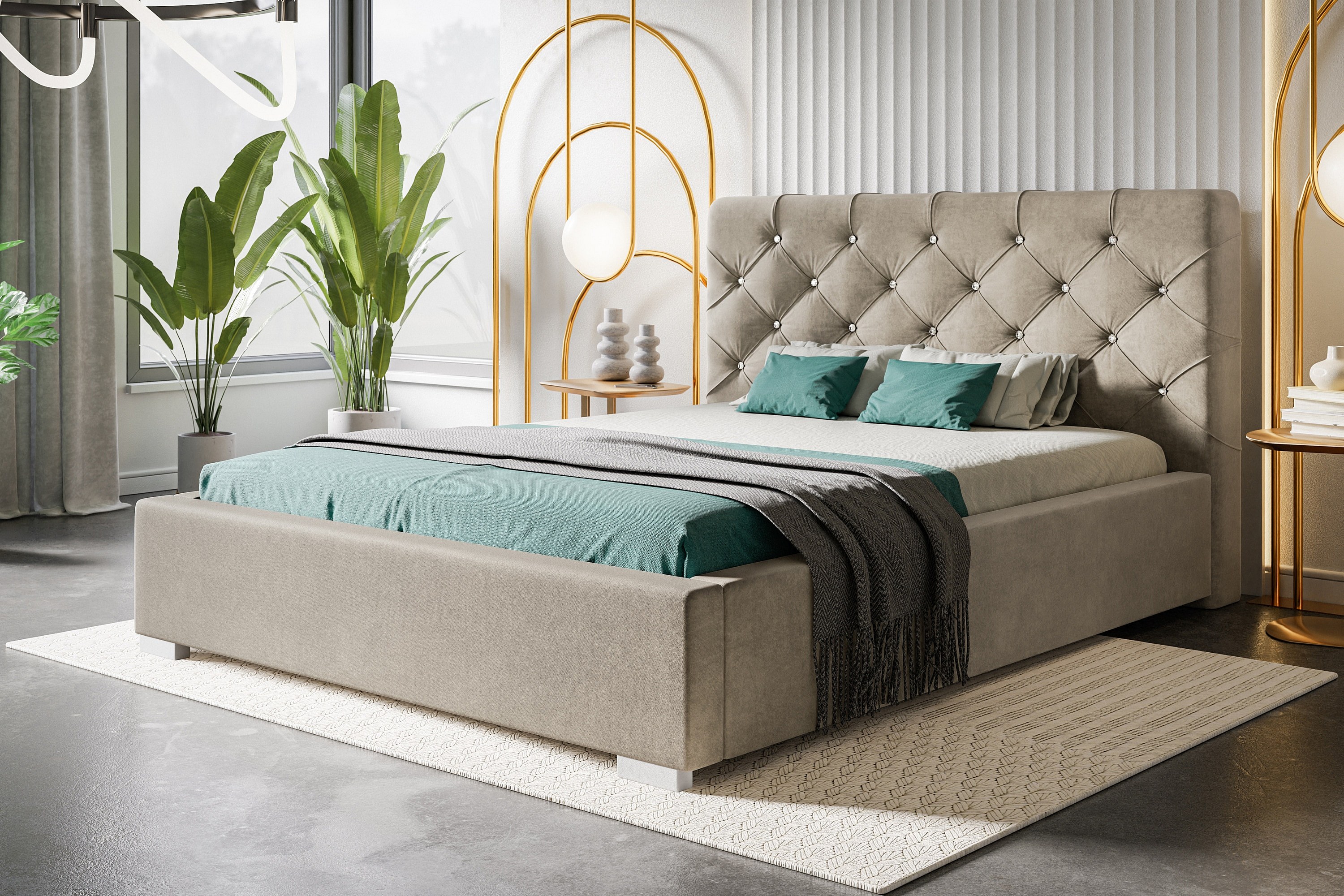 Lit rembourré Boston avec tête de lit, 140x200 cm, lit double avec coffre de rangement et sommier à lattes en bois, tissu velours, couleur : beige
