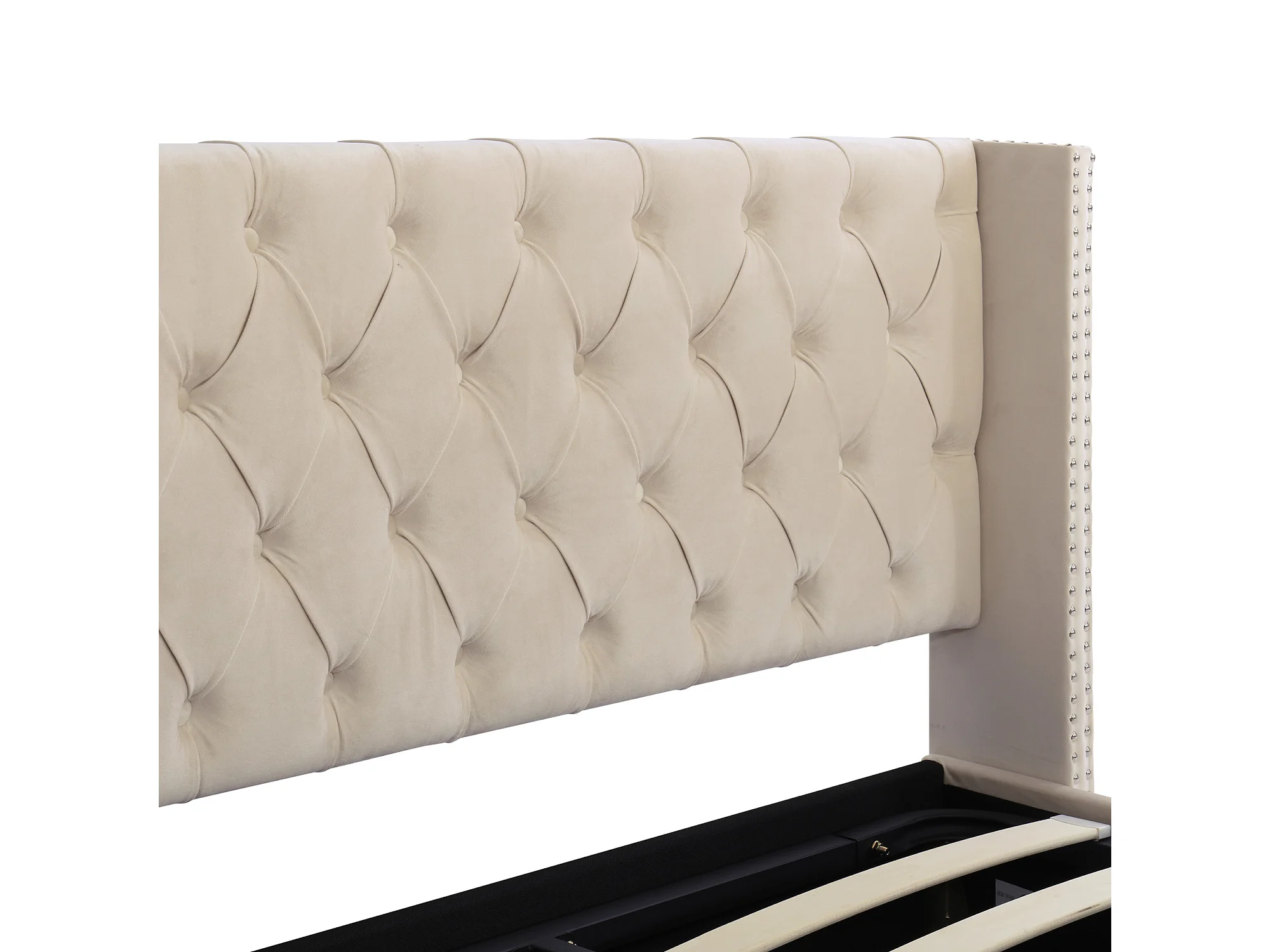 Lit rembourré Chesterfield beige 140x200 cm avec échelle, barrières de sécurité et rangement hydraulique pratique