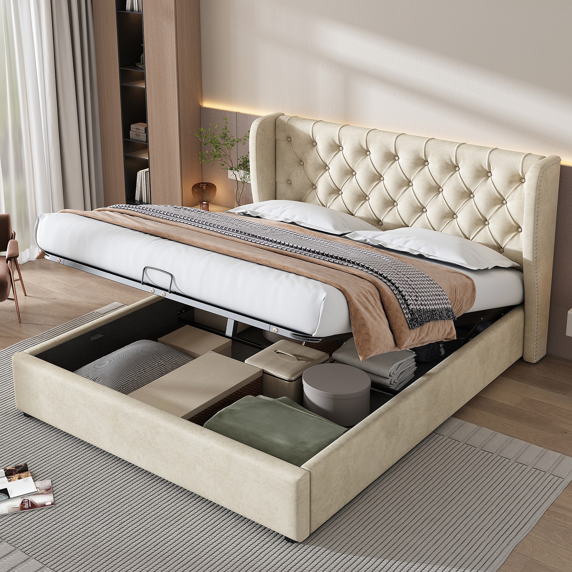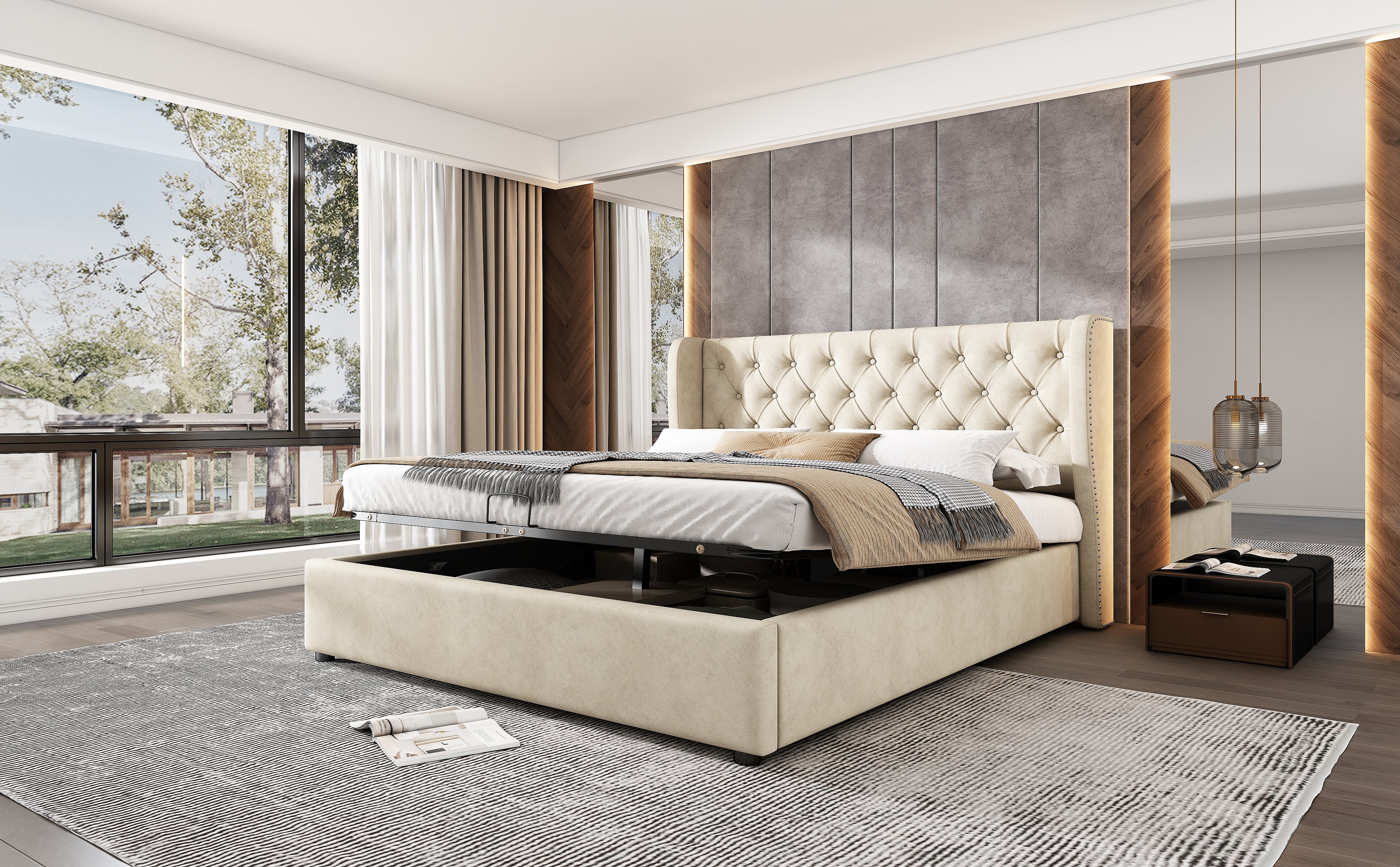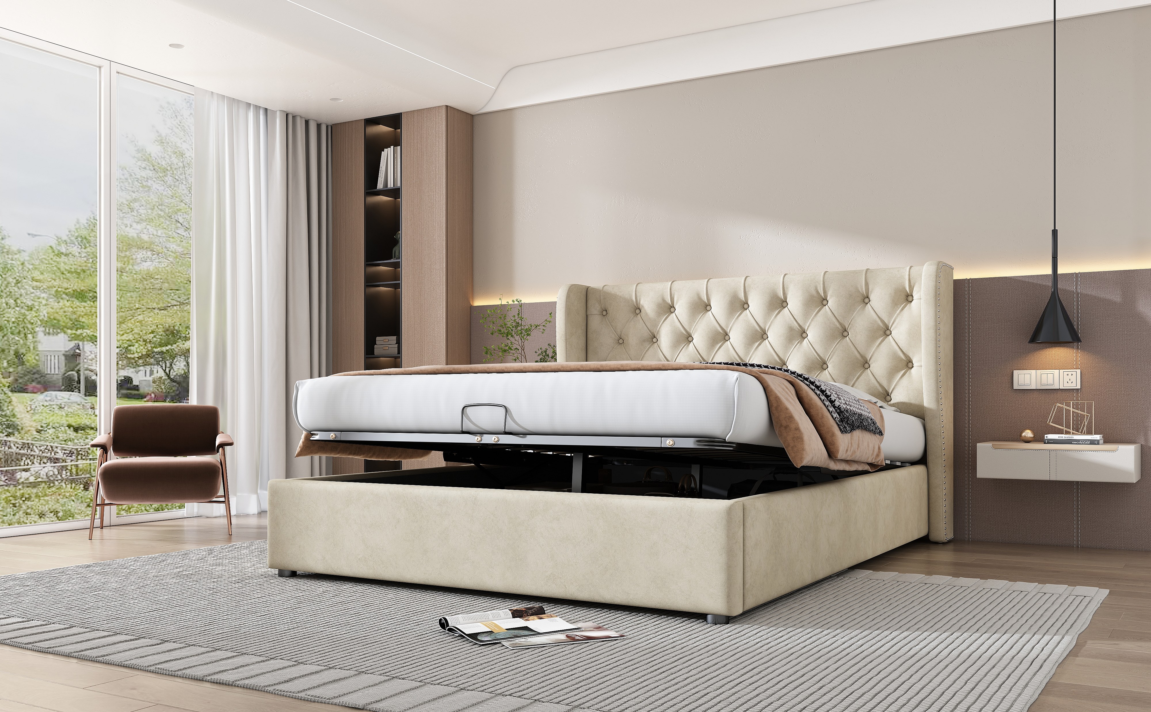 Lit rembourré Chesterfield beige 180x200 cm avec tête de lit haute et rangement hydraulique, confort optimal