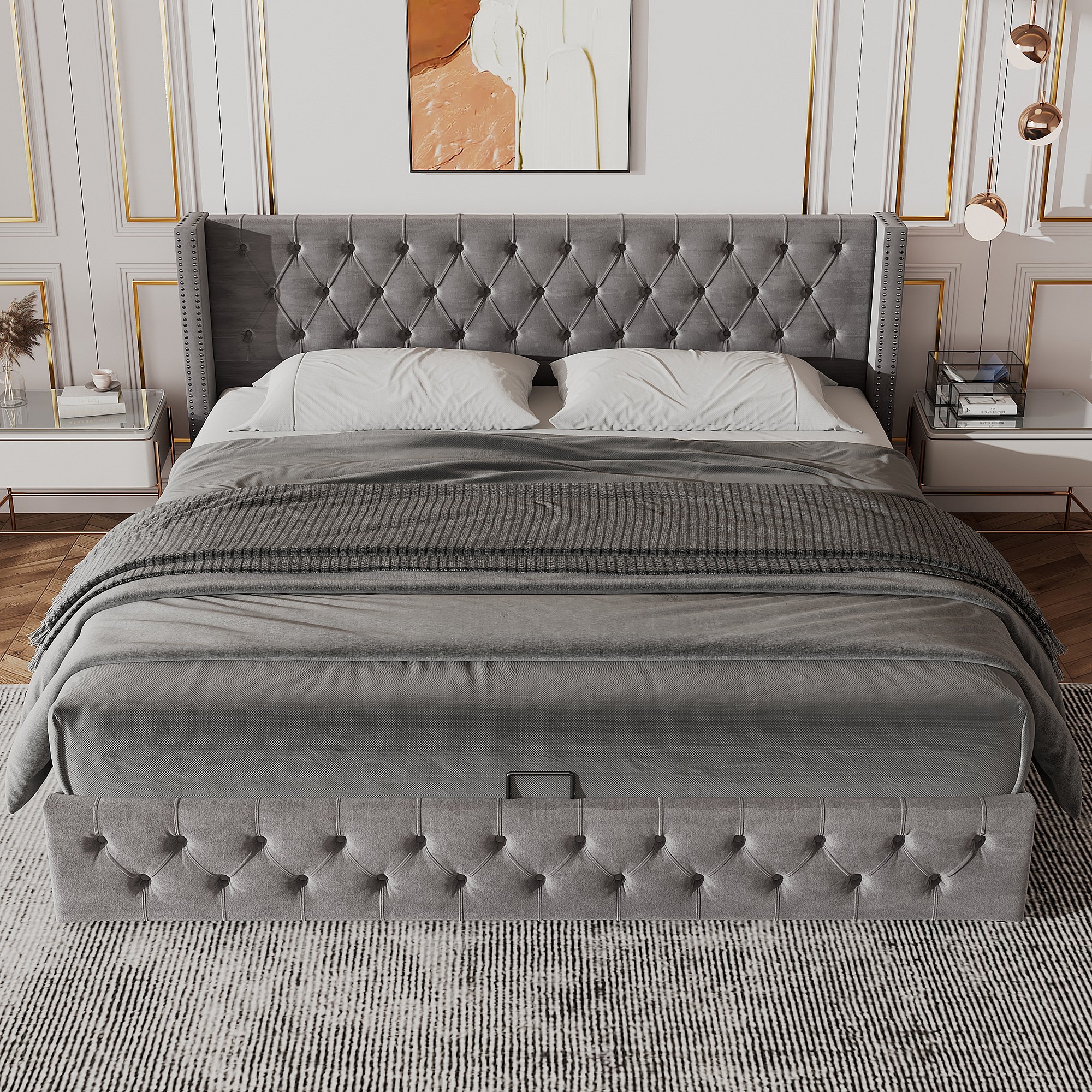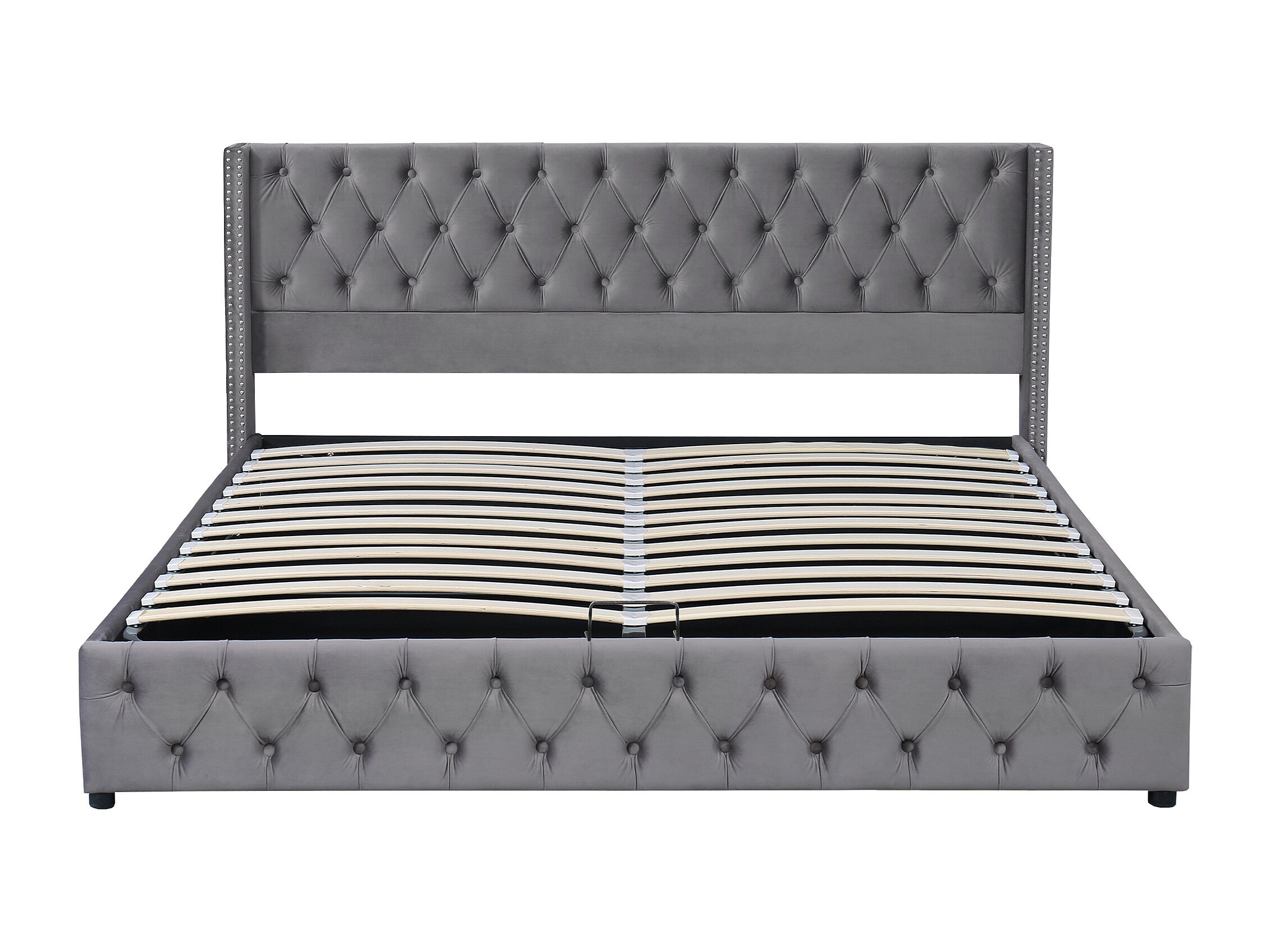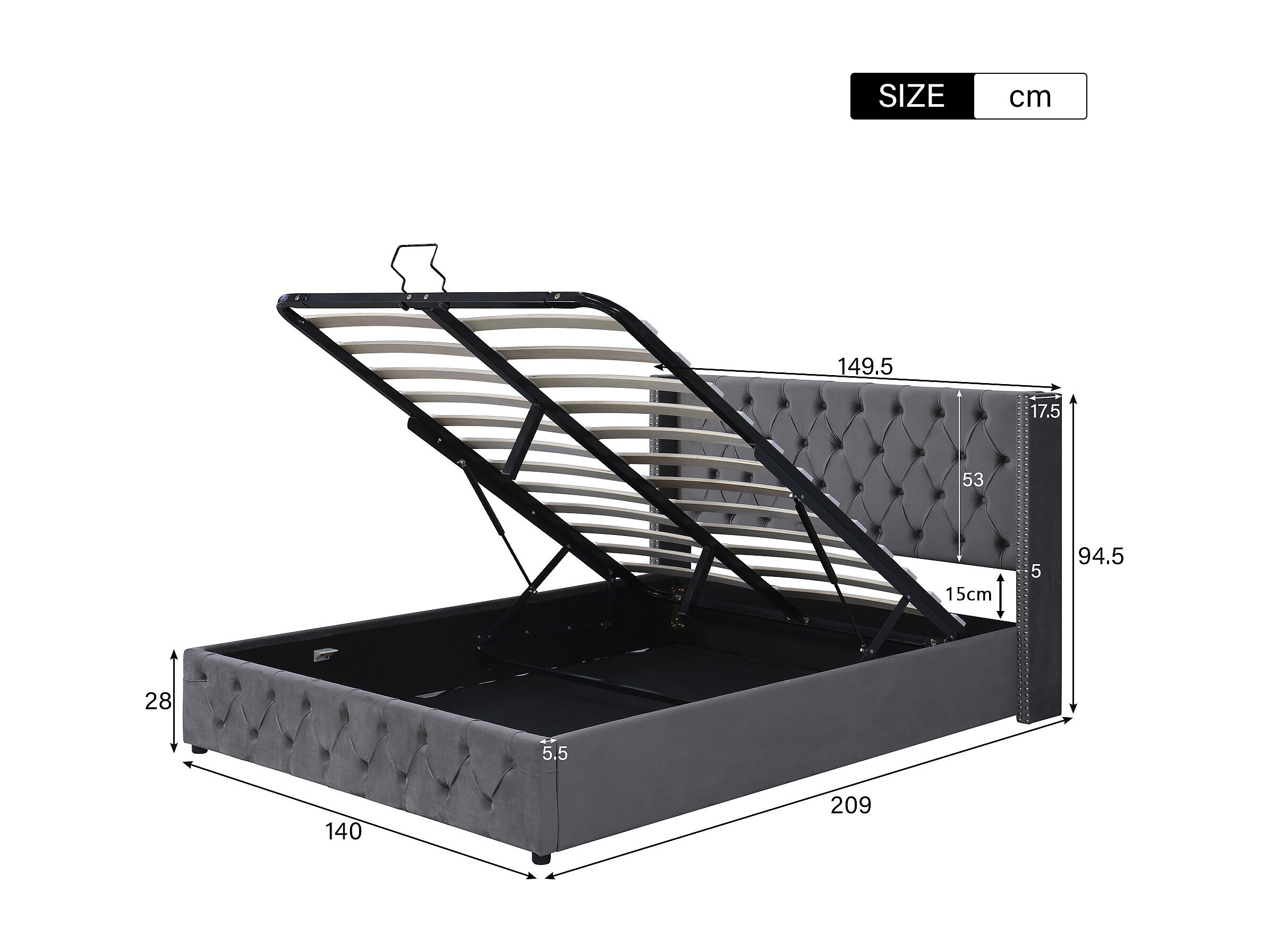 Lit rembourré Chesterfield gris 140x200 cm avec échelle et barrières de sécurité, design élégant et raffiné