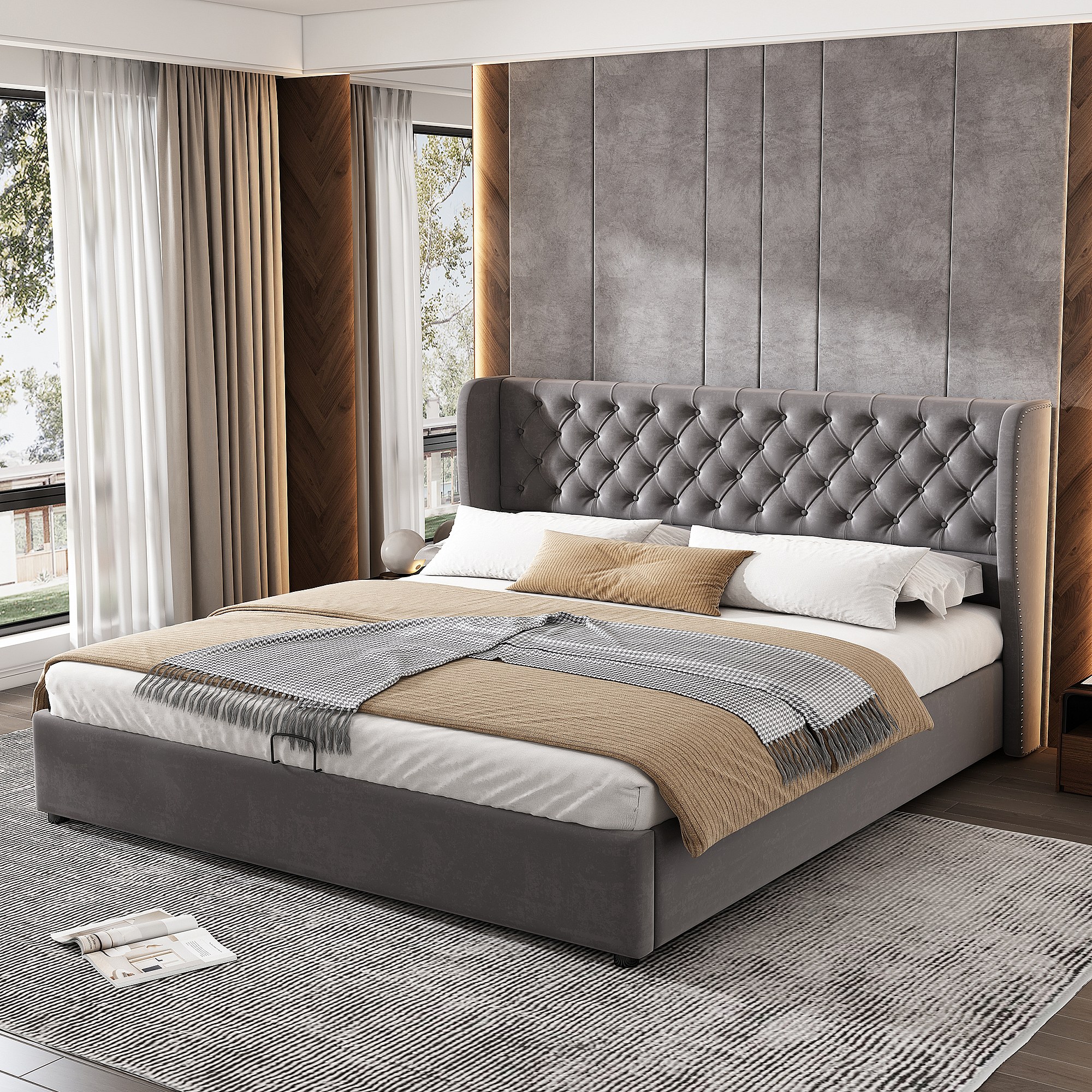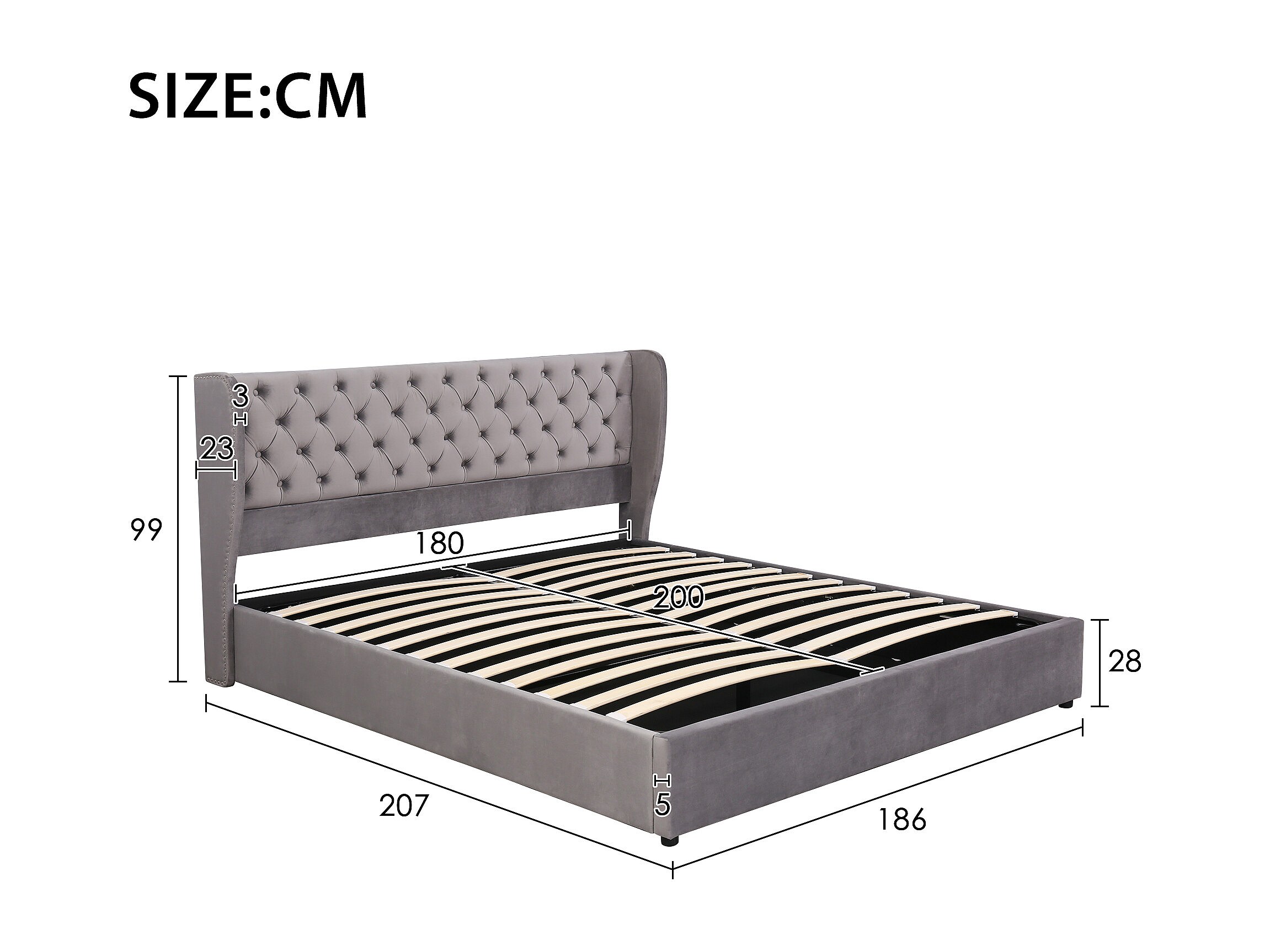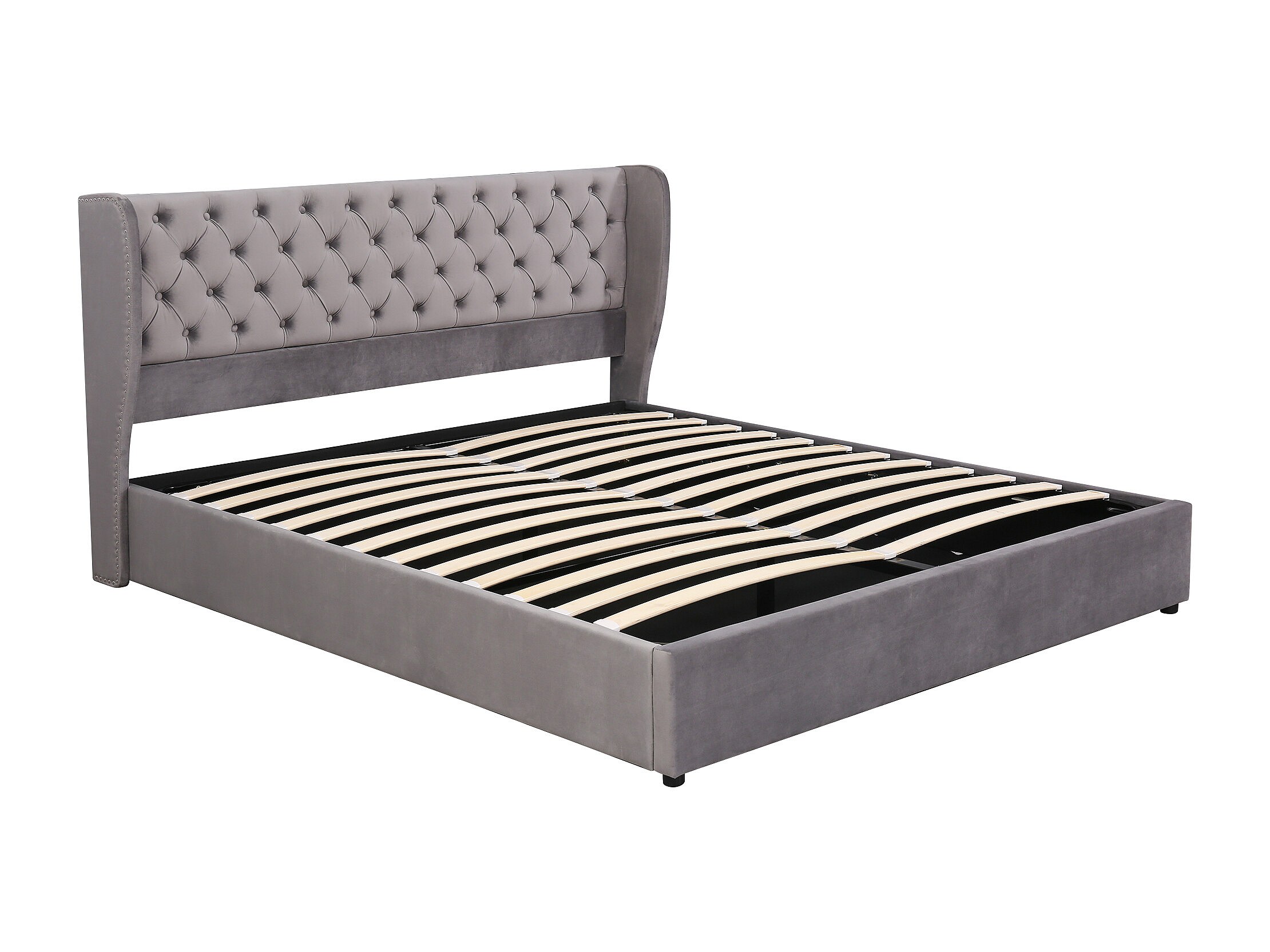 Lit rembourré Chesterfield gris 180x200 cm avec tête de lit haute et rangement hydraulique, chambre moderne
