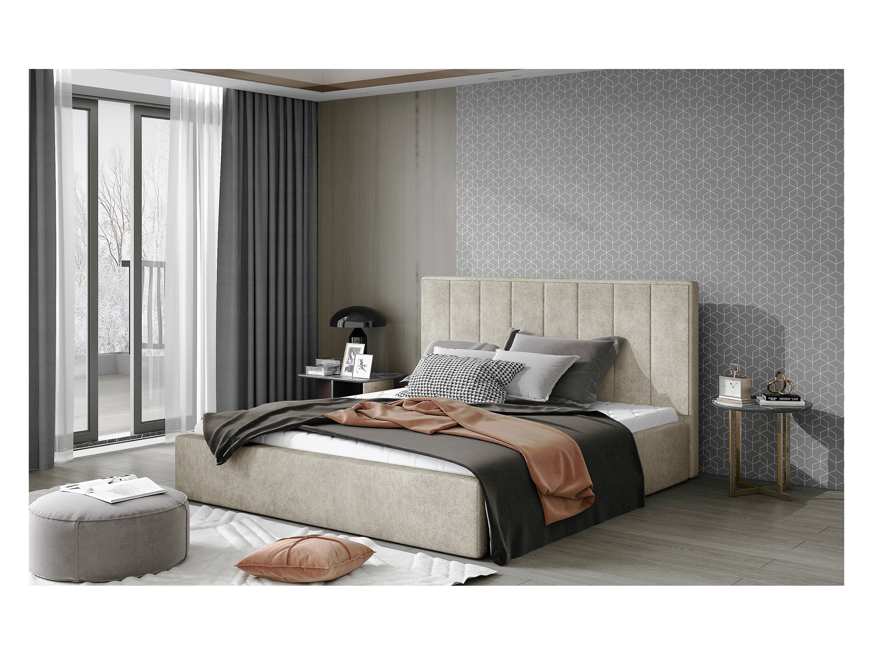 Lit rembourré de luxe tissu Vareze-Couleur Beige-140x200-Version avec sommier