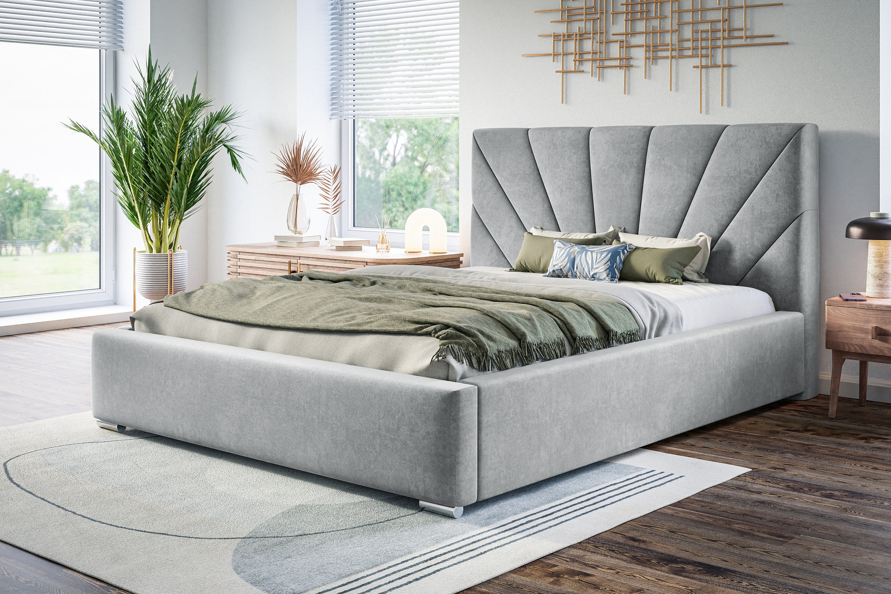 Lit rembourré Denver avec tête de lit, 160x200 cm, lit double avec coffre de rangement et sommier à lattes en bois, tissu velours, couleur : gris