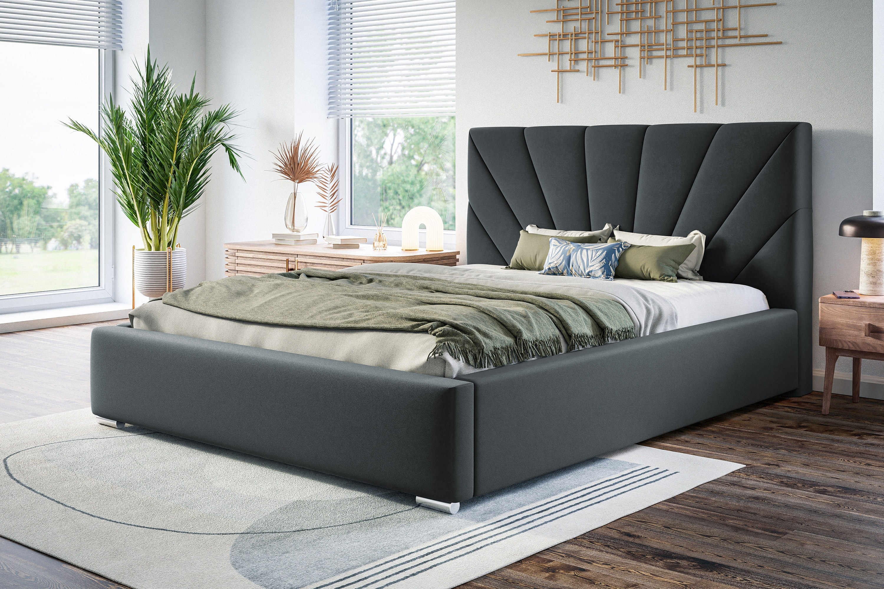 Lit rembourré Denver avec tête de lit, 160x200 cm, lit double avec coffre de rangement et sommier à lattes en bois, tissu velours, couleur : gris foncé