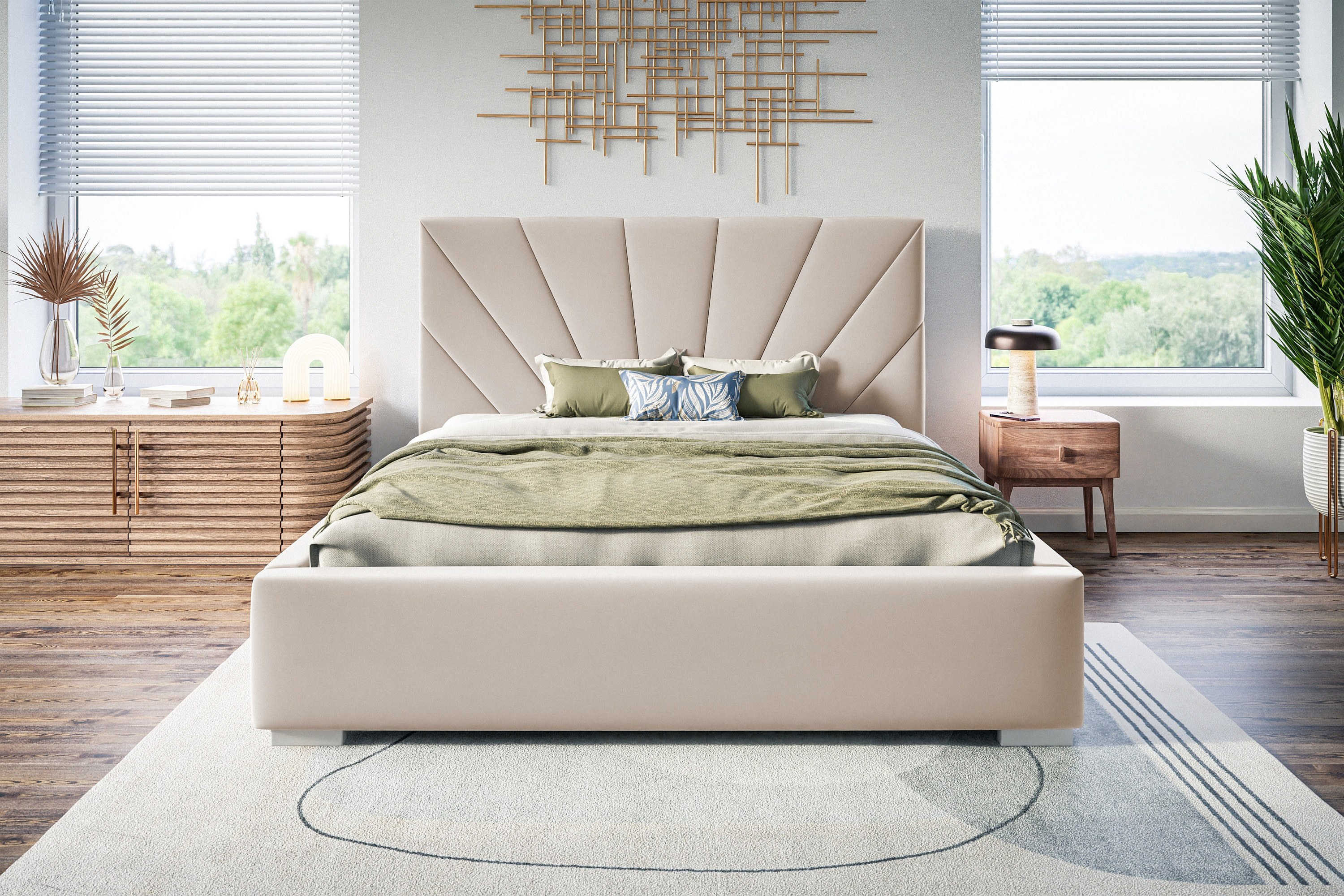 Lit rembourré Denver avec tête de lit, 160x200 cm, lit double avec coffre de rangement et sommier à lattes en bois, tissu velours, couleur : sable