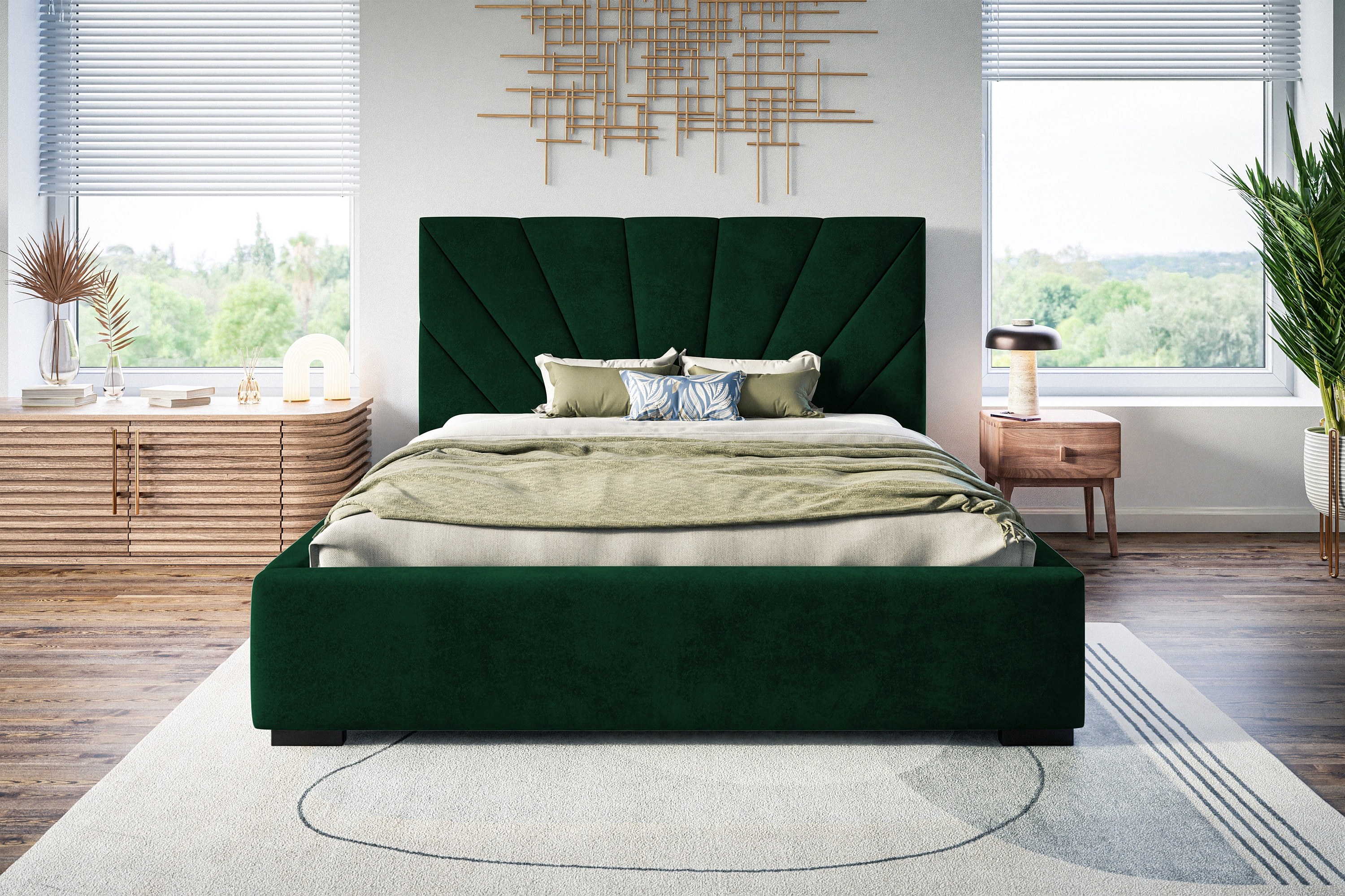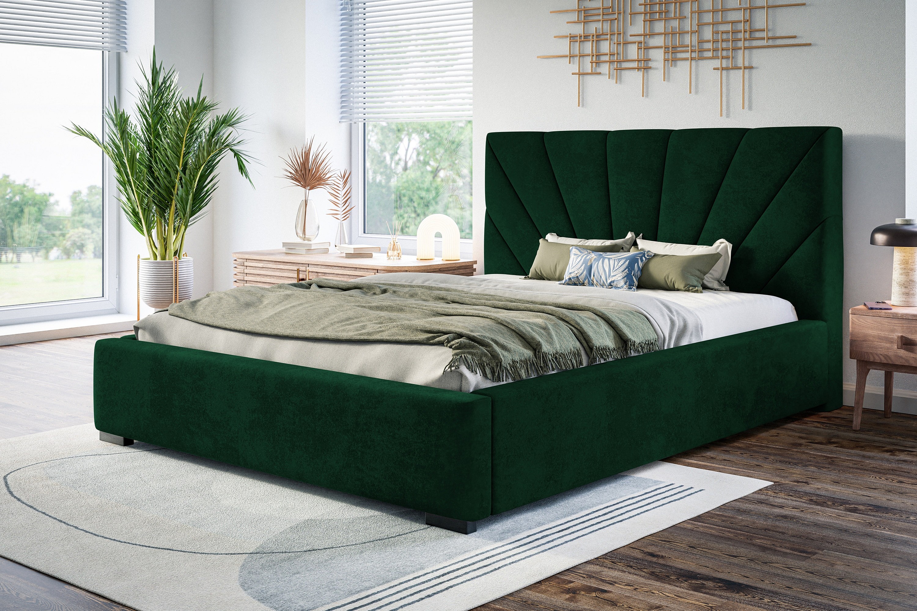 Lit rembourré Denver avec tête de lit, 160x200 cm, lit double avec coffre de rangement et sommier à lattes en bois, tissu velours, couleur : vert
