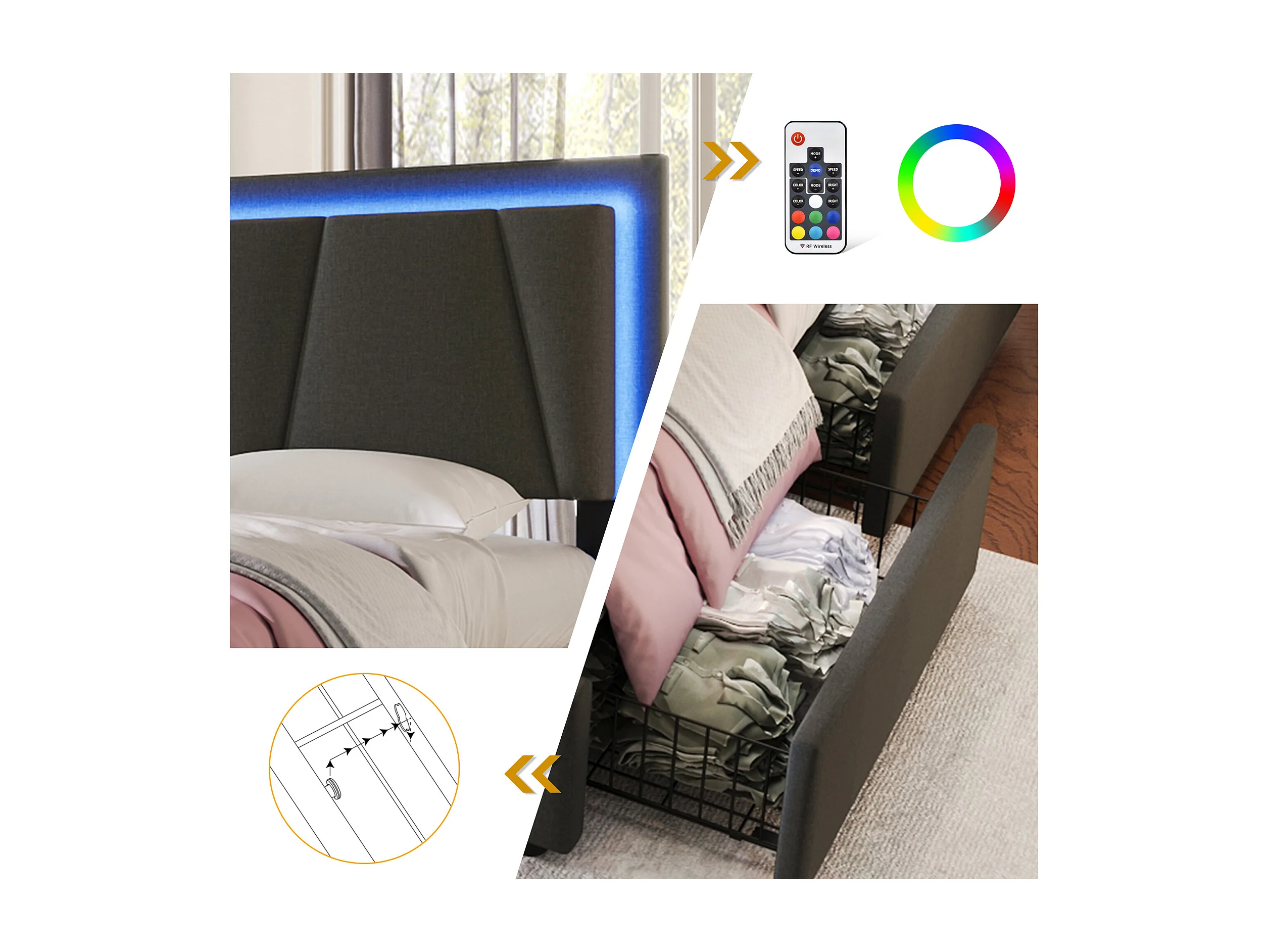 Lit rembourré en bois 160x200 cm avec éclairage LED et 4 tiroirs - Gris(matelas inclus)