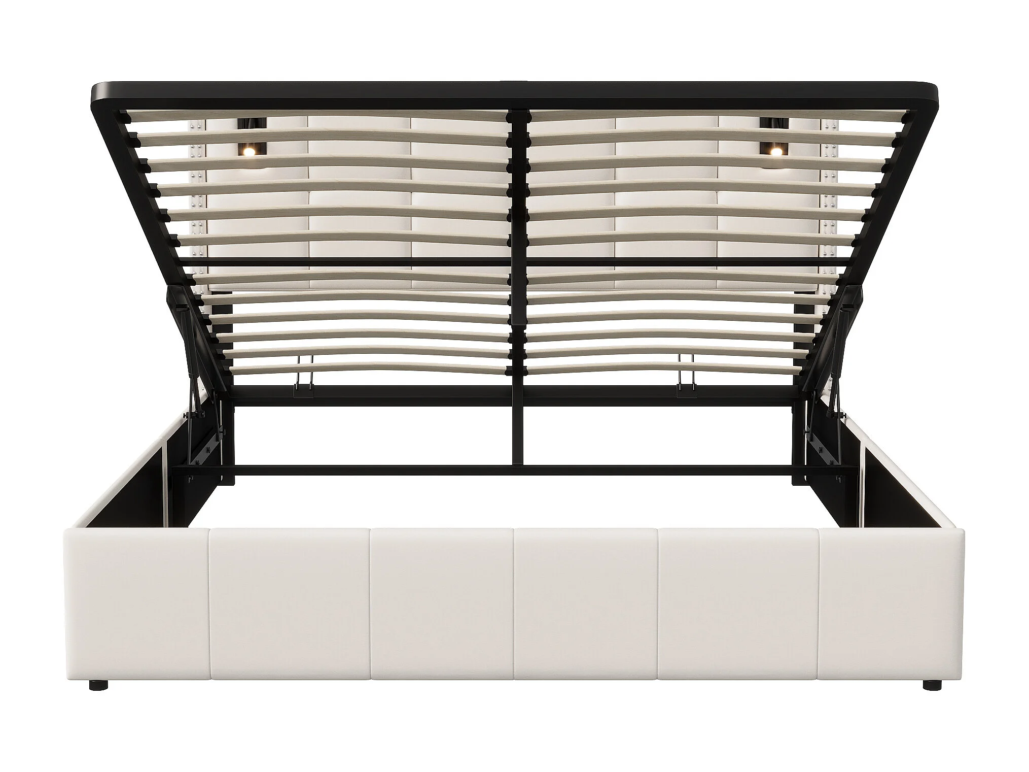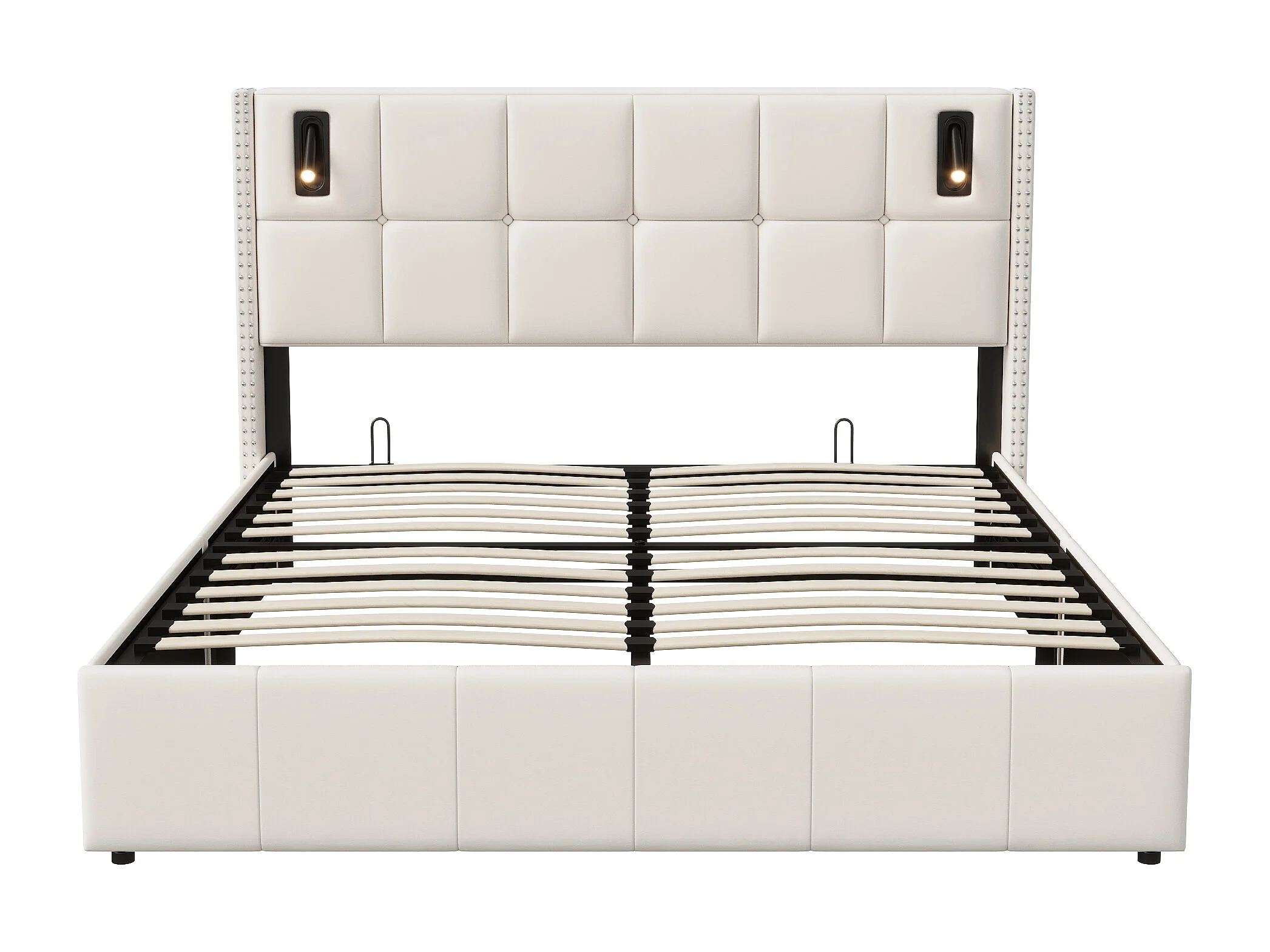 Lit rembourré en velours 160 x 200 cm - cadre de lit double - tête avec 2 lampes de lecture et port de charge USB lit de stockage hydraulique - Beige