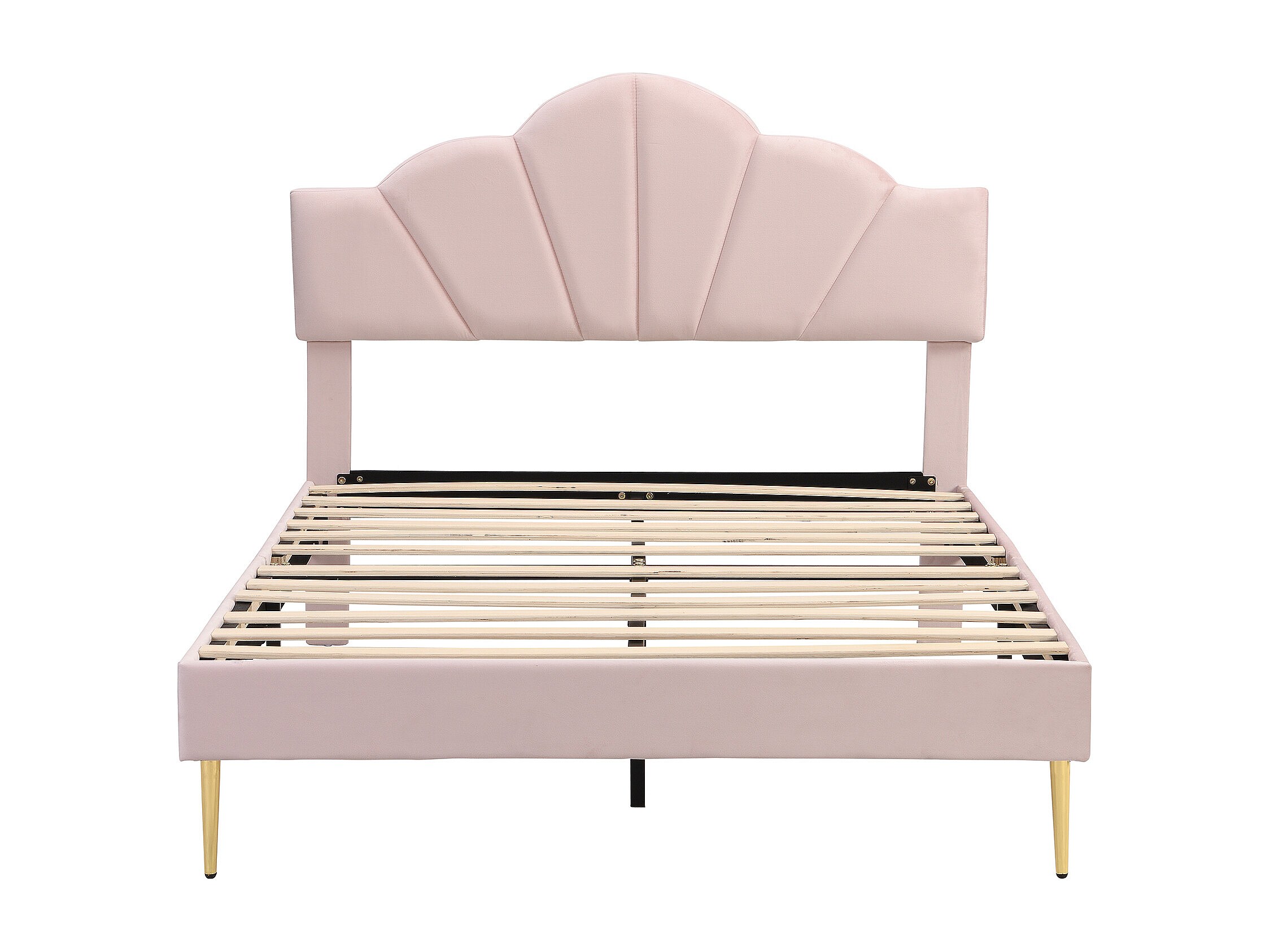 Lit rembourré en velours rose 140×190 cm avec tête de lit réglable et pieds en fer doré