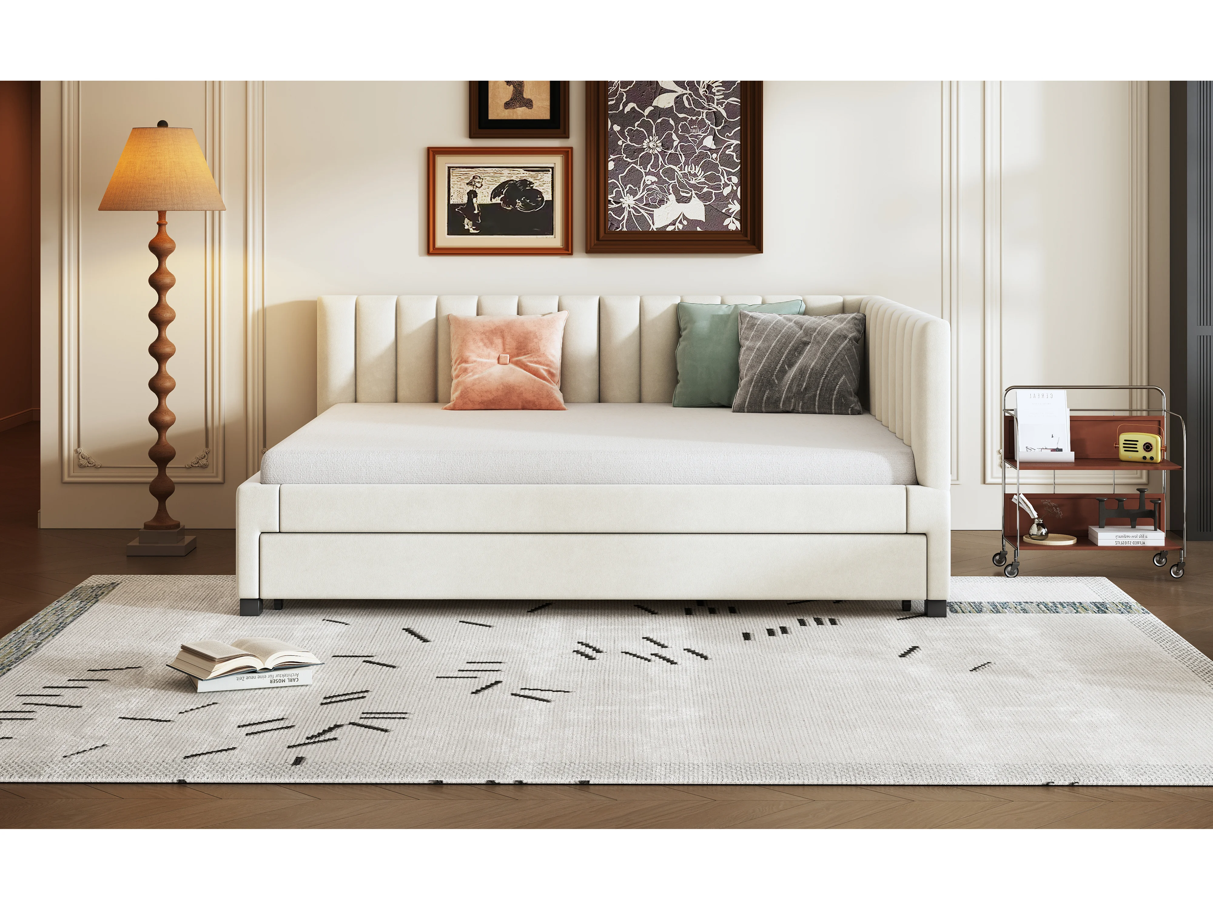 Lit rembourré extensible 140x200 cm avec sommier, velours beige, lit multifonction adapté aux chambres d’amis