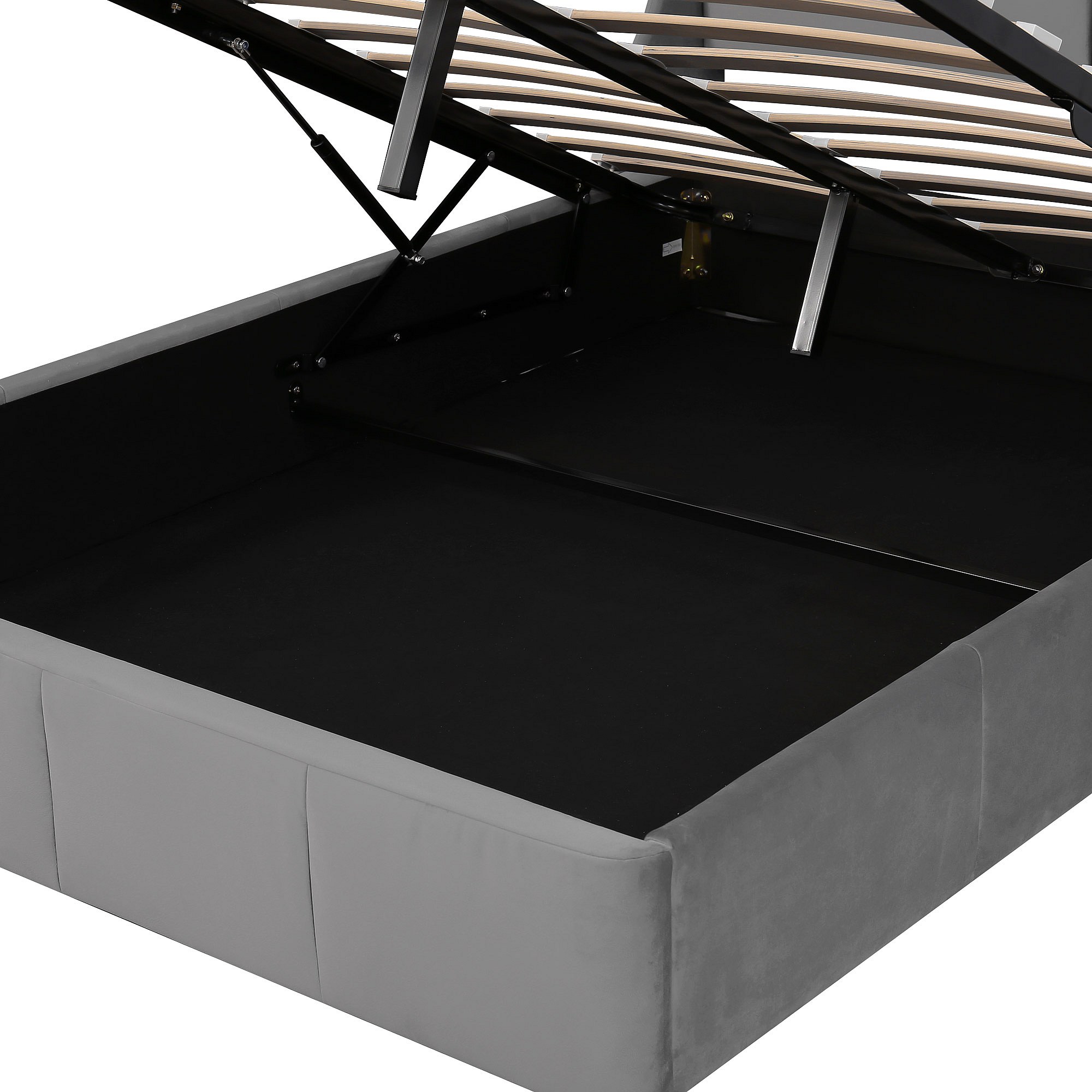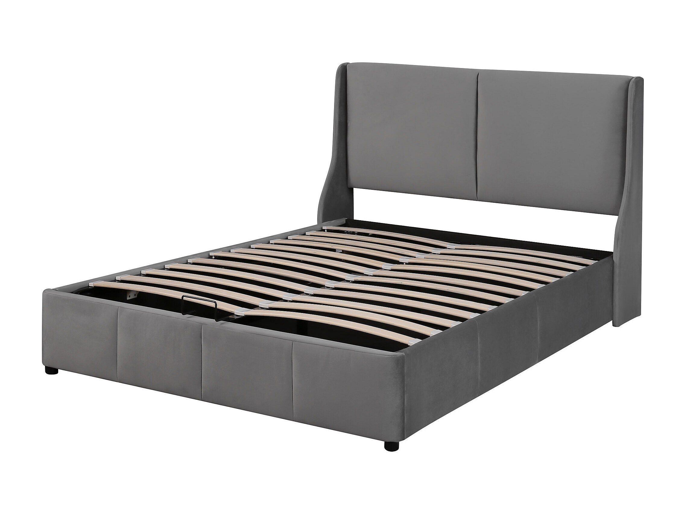 Lit rembourré gris 140x190 cm avec coffre et vérins hydrauliques, design fonctionnel et moderne pour chambre