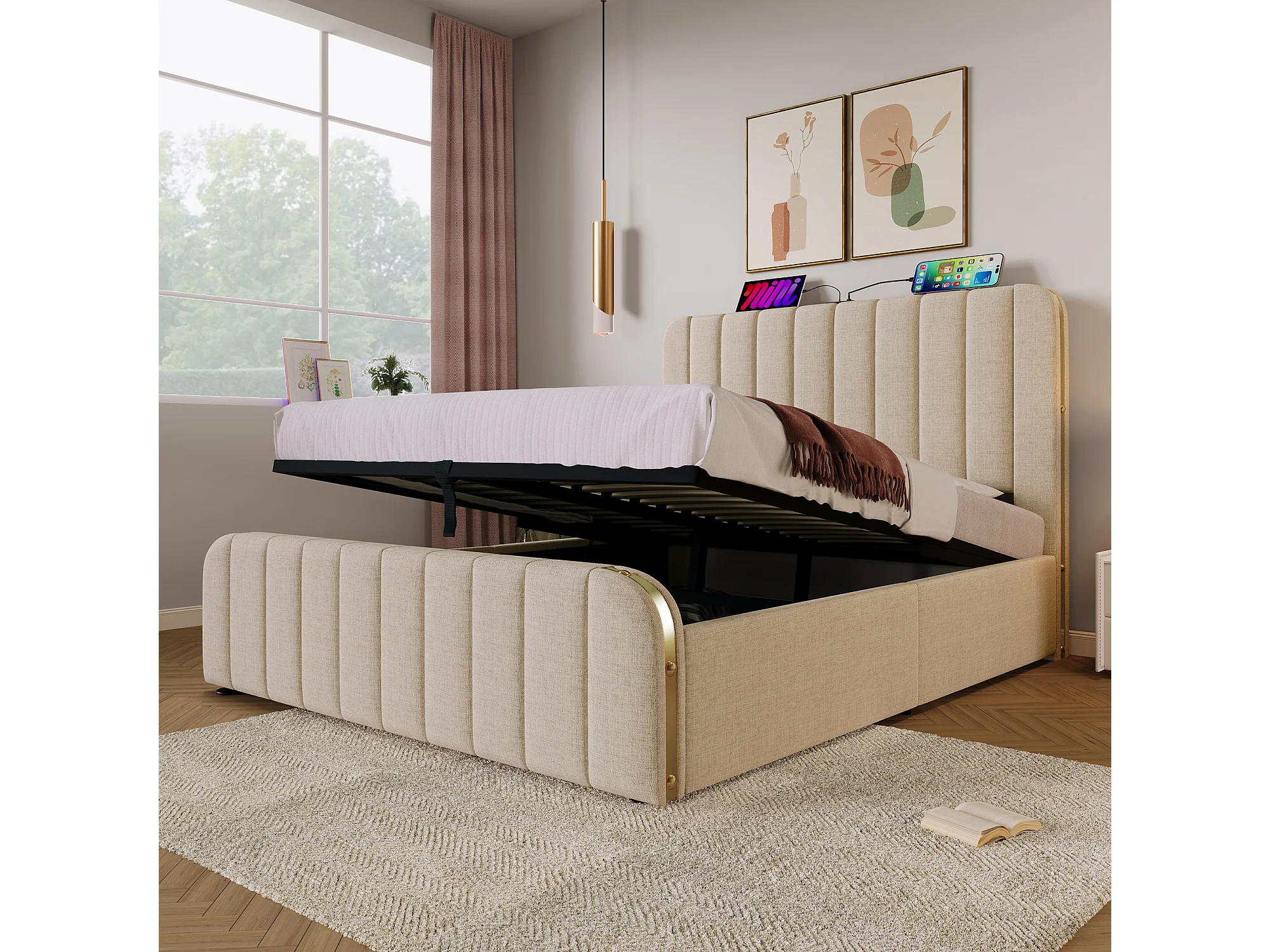 Lit rembourré hydraulique 140x200cm, tête de lit ornée de rayures dorées et USB Type-C, lit coffre, lin, beige, avec matelas