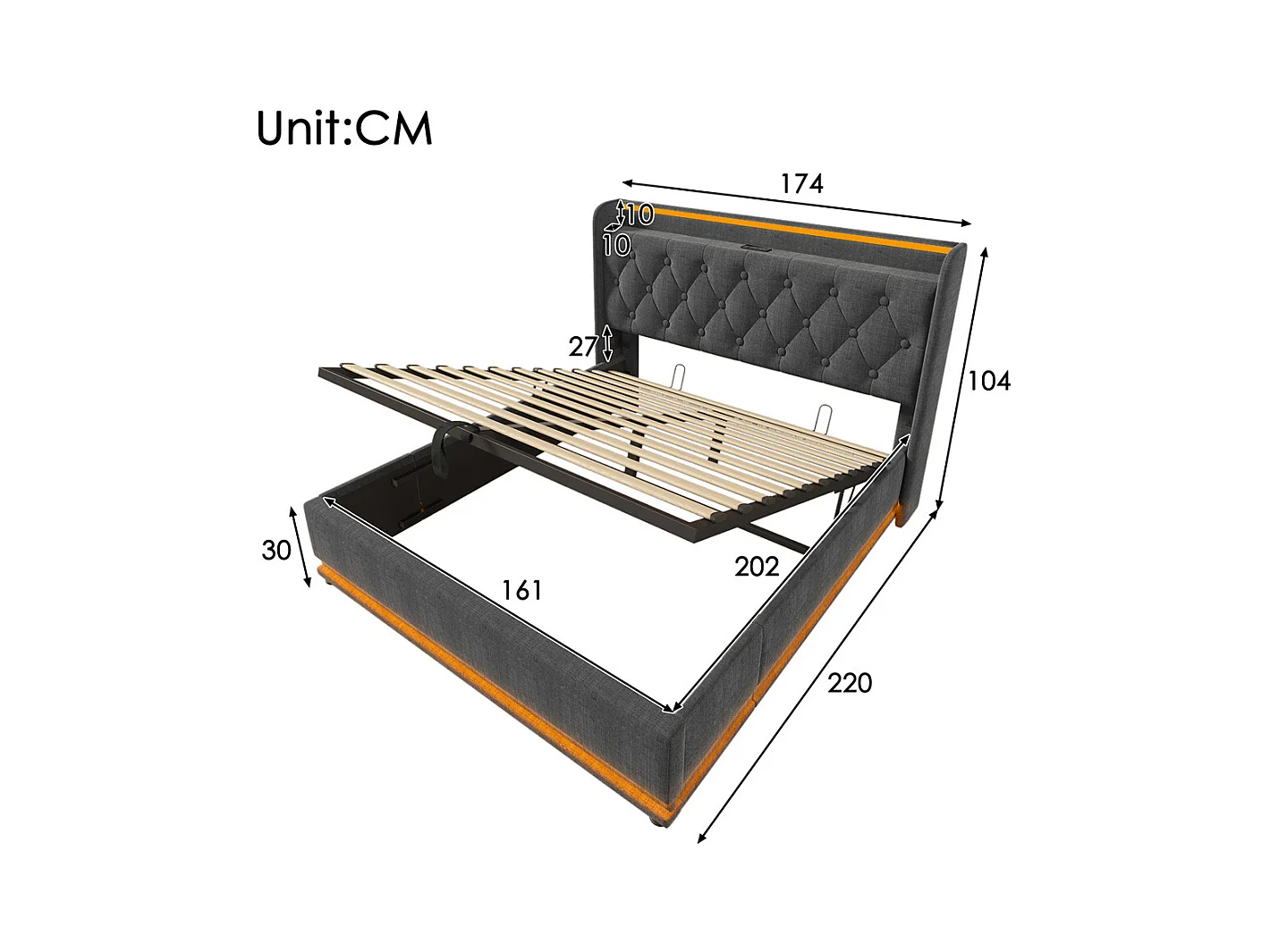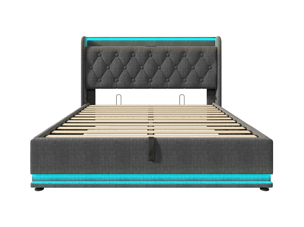 Lit rembourré hydraulique 160x200 cm lit appui-tête rembourré avec fonction de recharge usb type-c lit double lin gris
