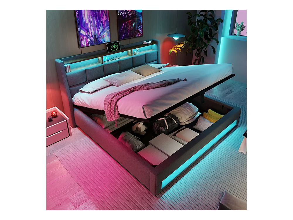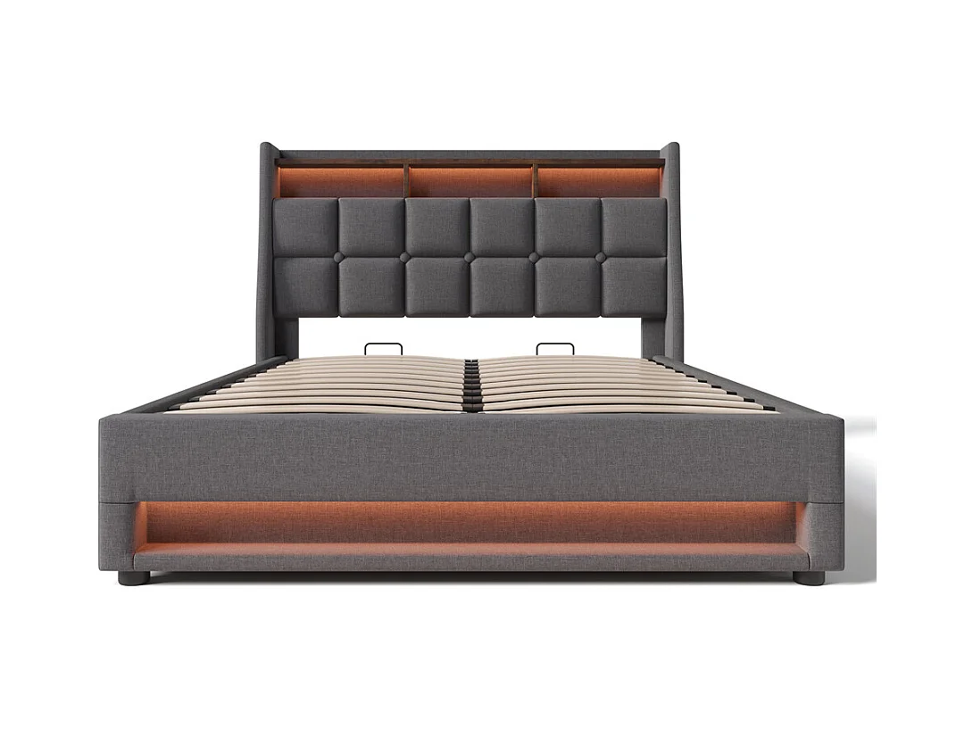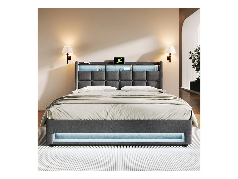 lit rembourré hydraulique 160x200 cm, lit de rangement LED avec port USB, sommier à lattes et cadre métallique, lin, gris