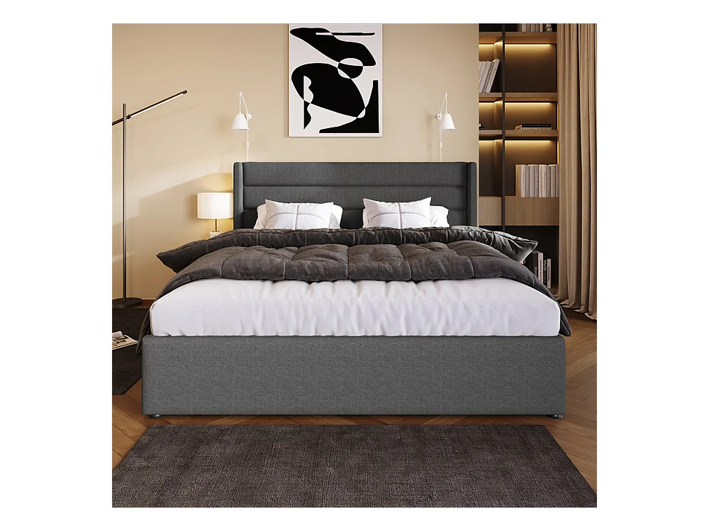 Lit rembourré hydraulique 160x200 cm lit de rangement lit sommier à lattes en bois lit en métal lit double lin gris