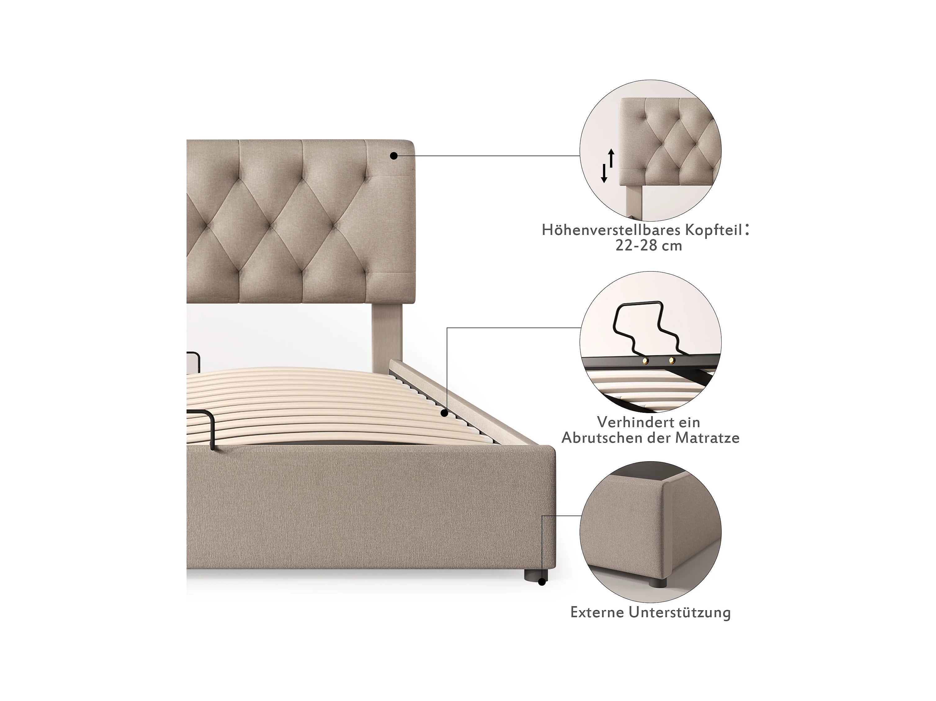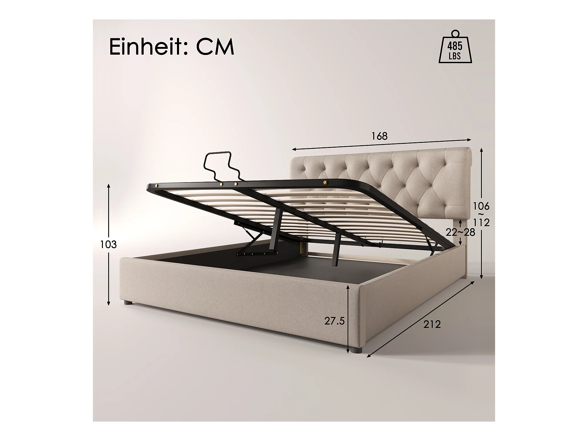 Lit Rembourré Hydraulique 160X200cm - Tête De Lit Réglable - Sommier À Lattes En Métal - Espace De Rangement - Matelas Inclus