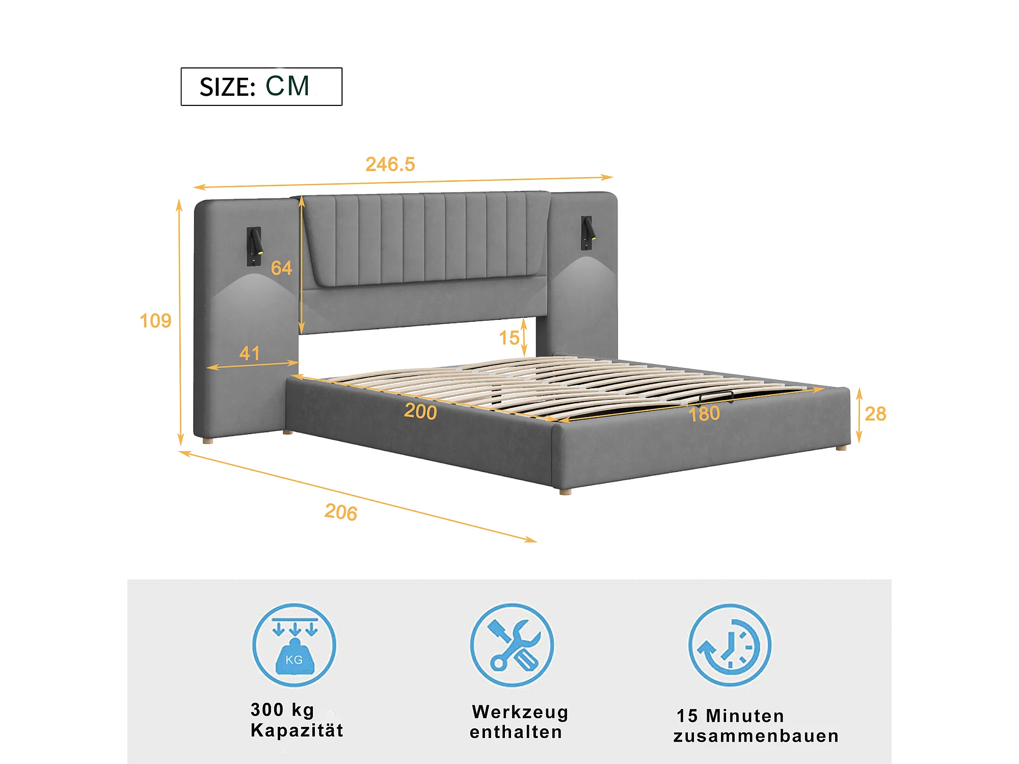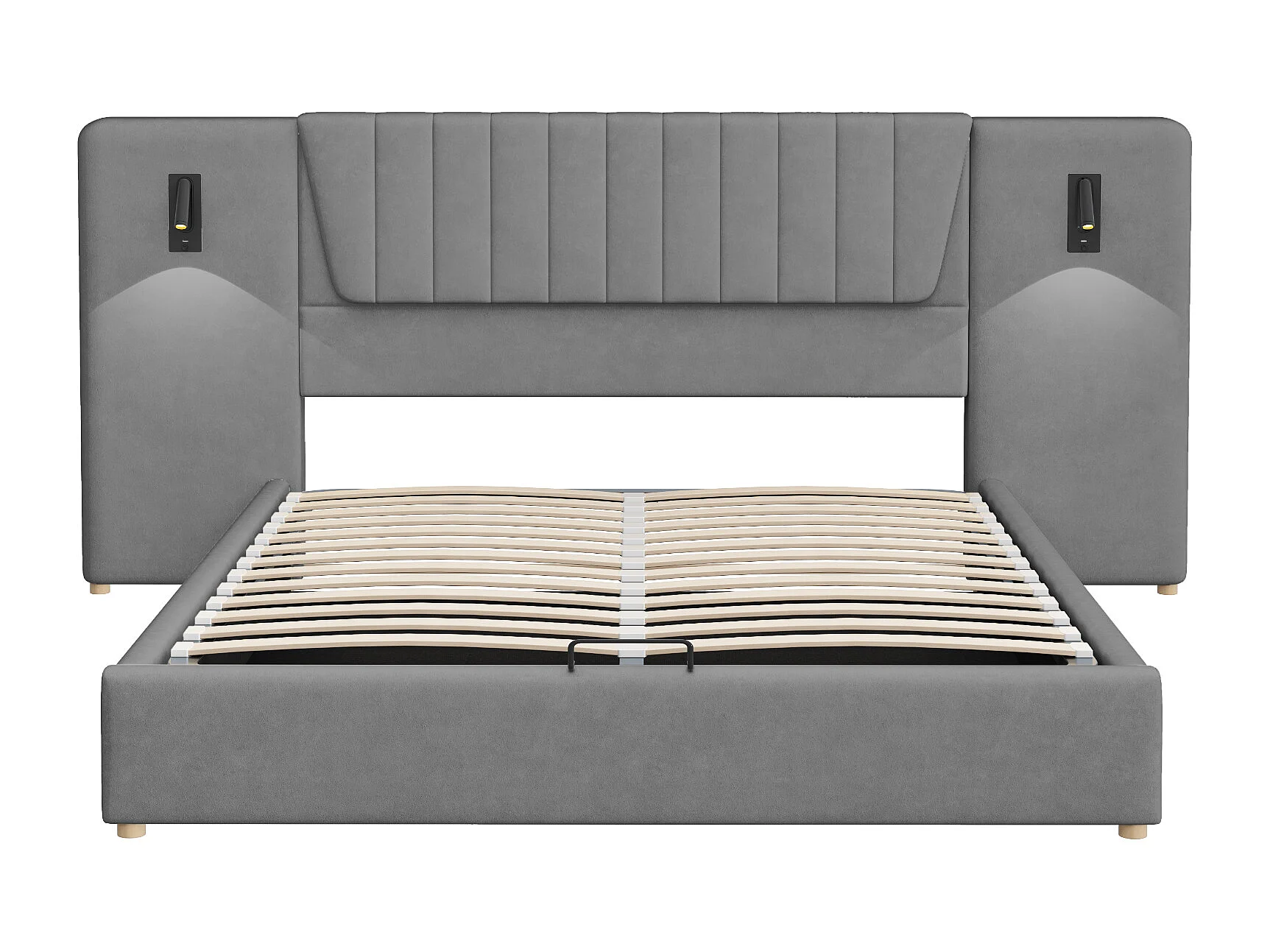 Lit rembourré hydraulique 180x200cm, avec dossier,lampe de lecture et port de chargement USB, lit coffre, velours,gris,sans matelas