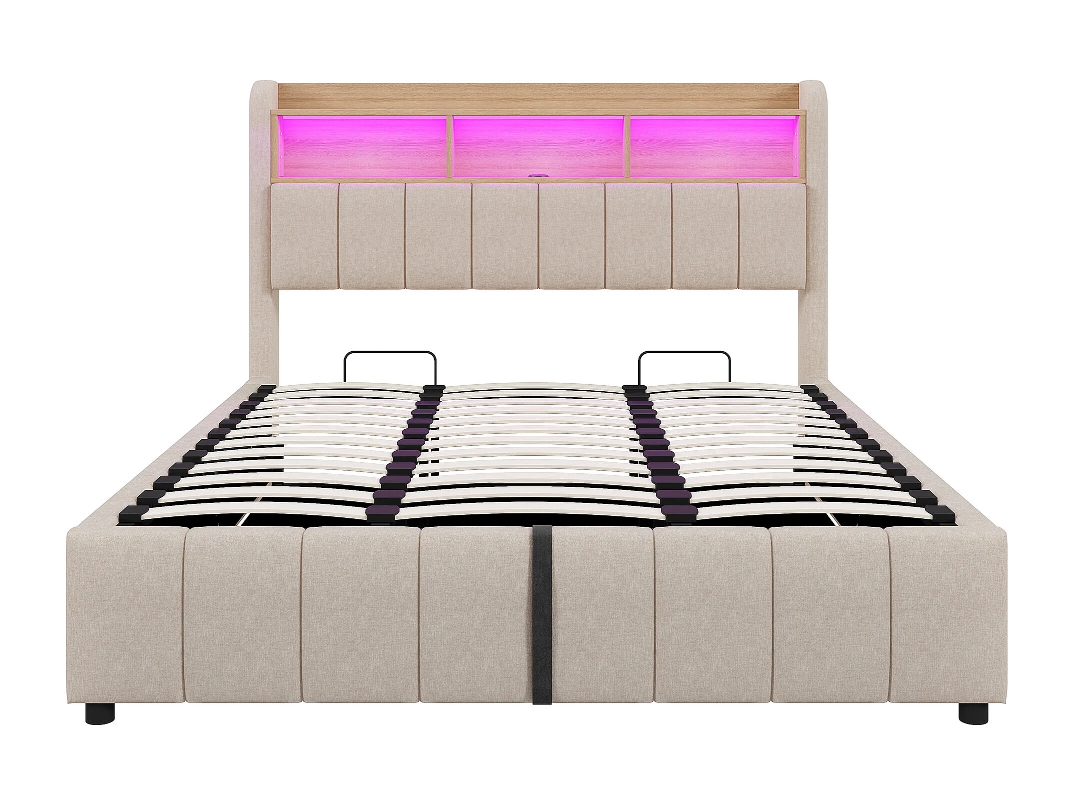 Lit rembourré hydraulique 180x200cm, avec éclairage LED et prise USB, rangement, deux places, tissu lin, beige, sans matelas