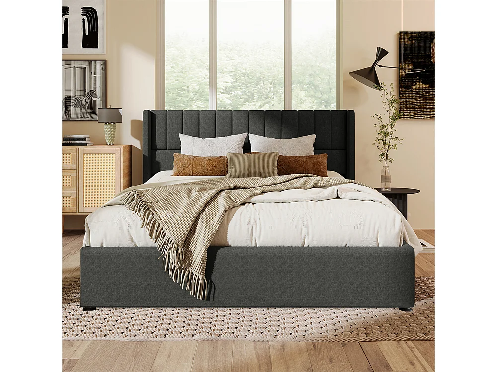 Lit rembourré hydraulique lit coffre 140x200 cm lit de rangement lit en métal lit cadre à lattes en bois lit double lin gris