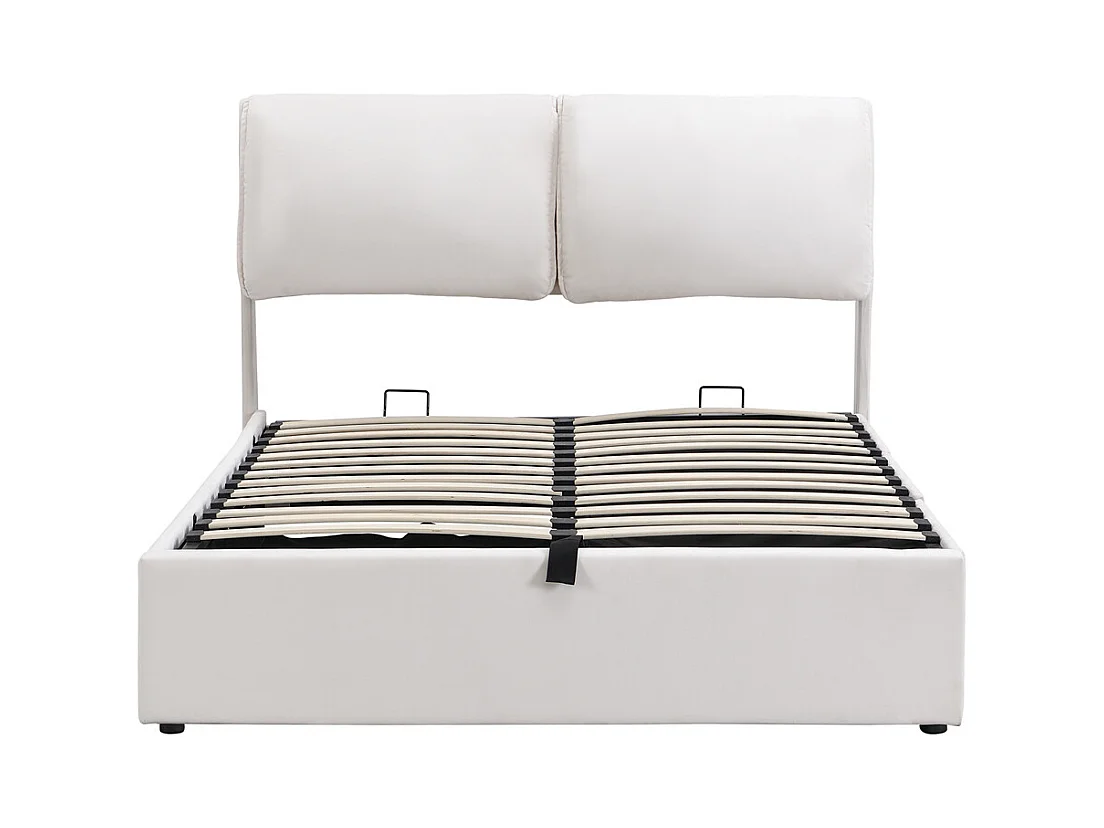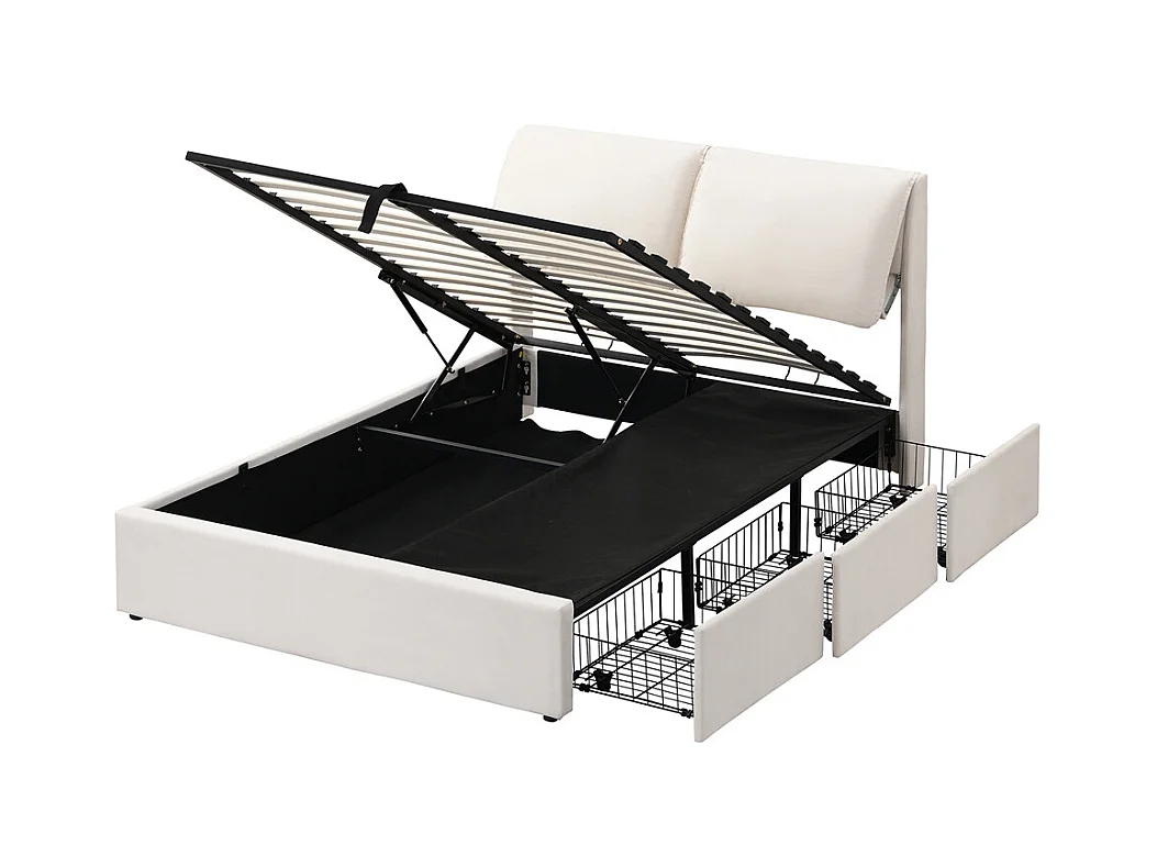 Lit rembourré hydraulique lit coffre 140x200 cm lit de rangement lit trois tiroirs lit cadre et tête de lit à lattes velours blanc