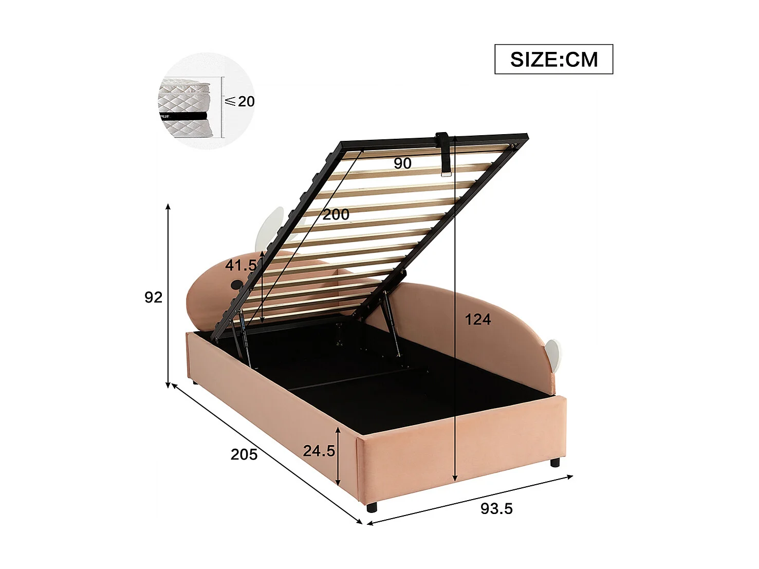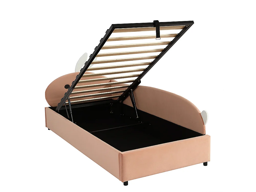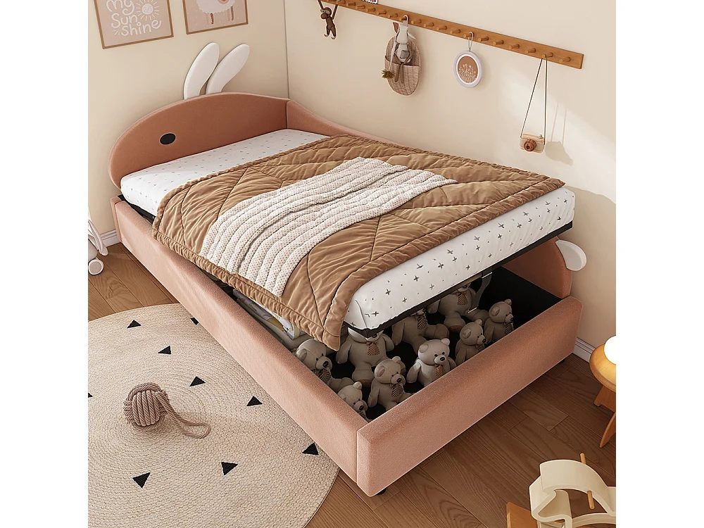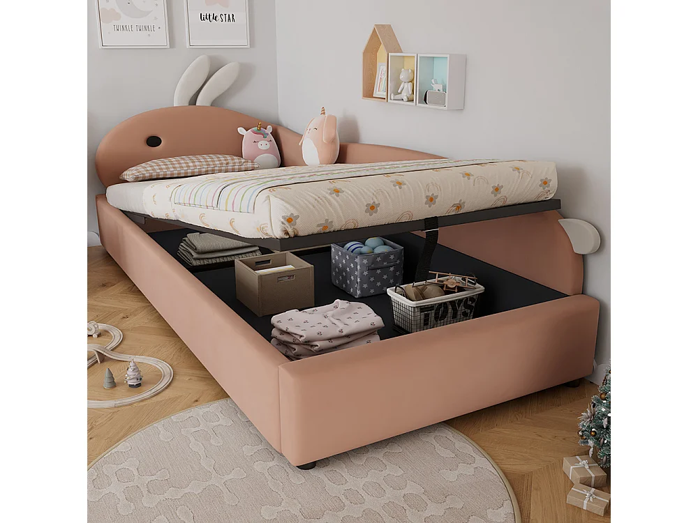 Lit rembourré hydraulique, lit simple, lit enfant, 90x200cm, avec tête de lit lapin mignon,barrière,lit coffre, velours, rose+blanc