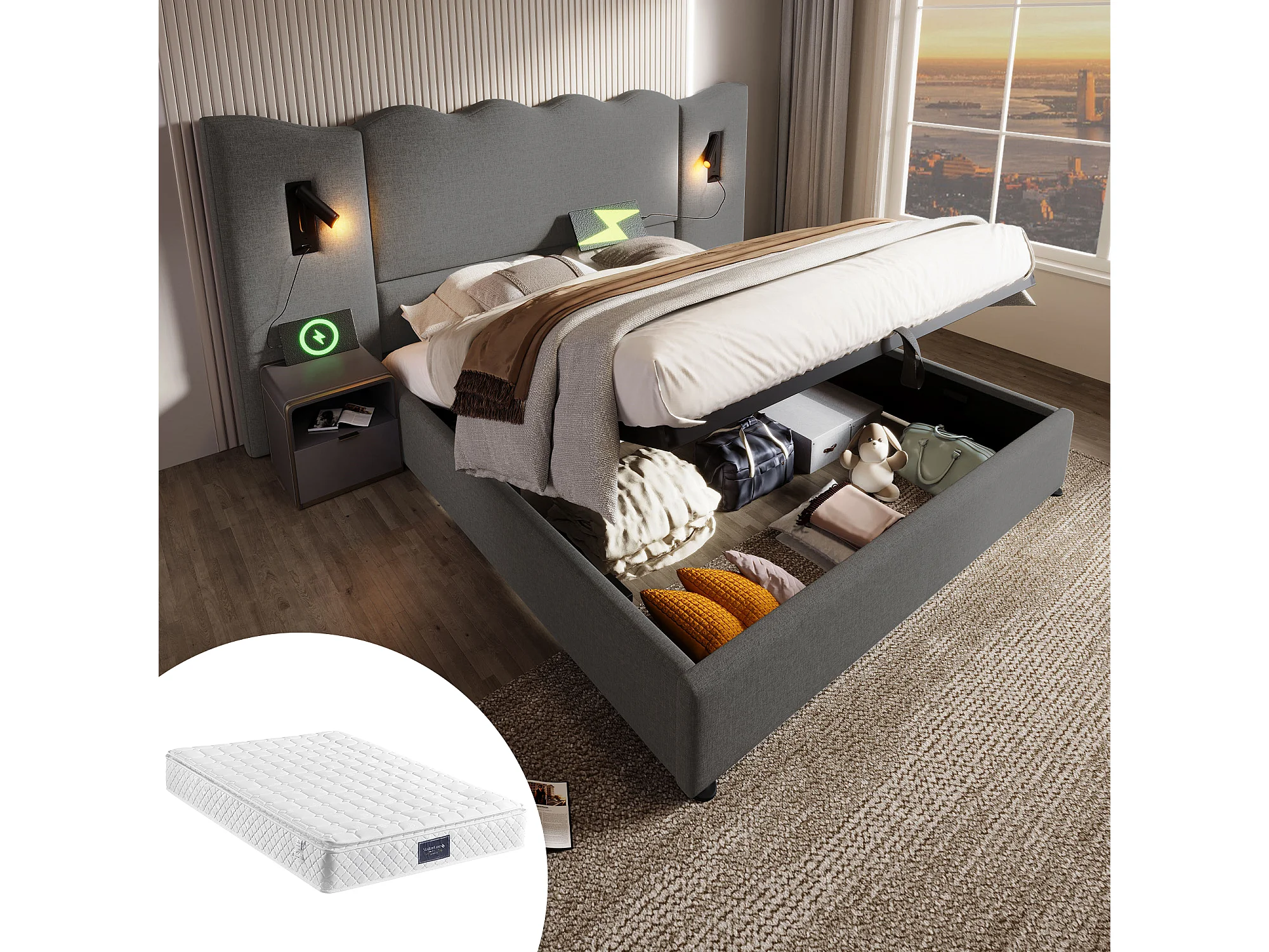 Lit rembourré, lit double 160x200cm, avec lampe de lecture, USB Type-C et sommier à lattes, lit coffre, lin, gris, matelas inclus