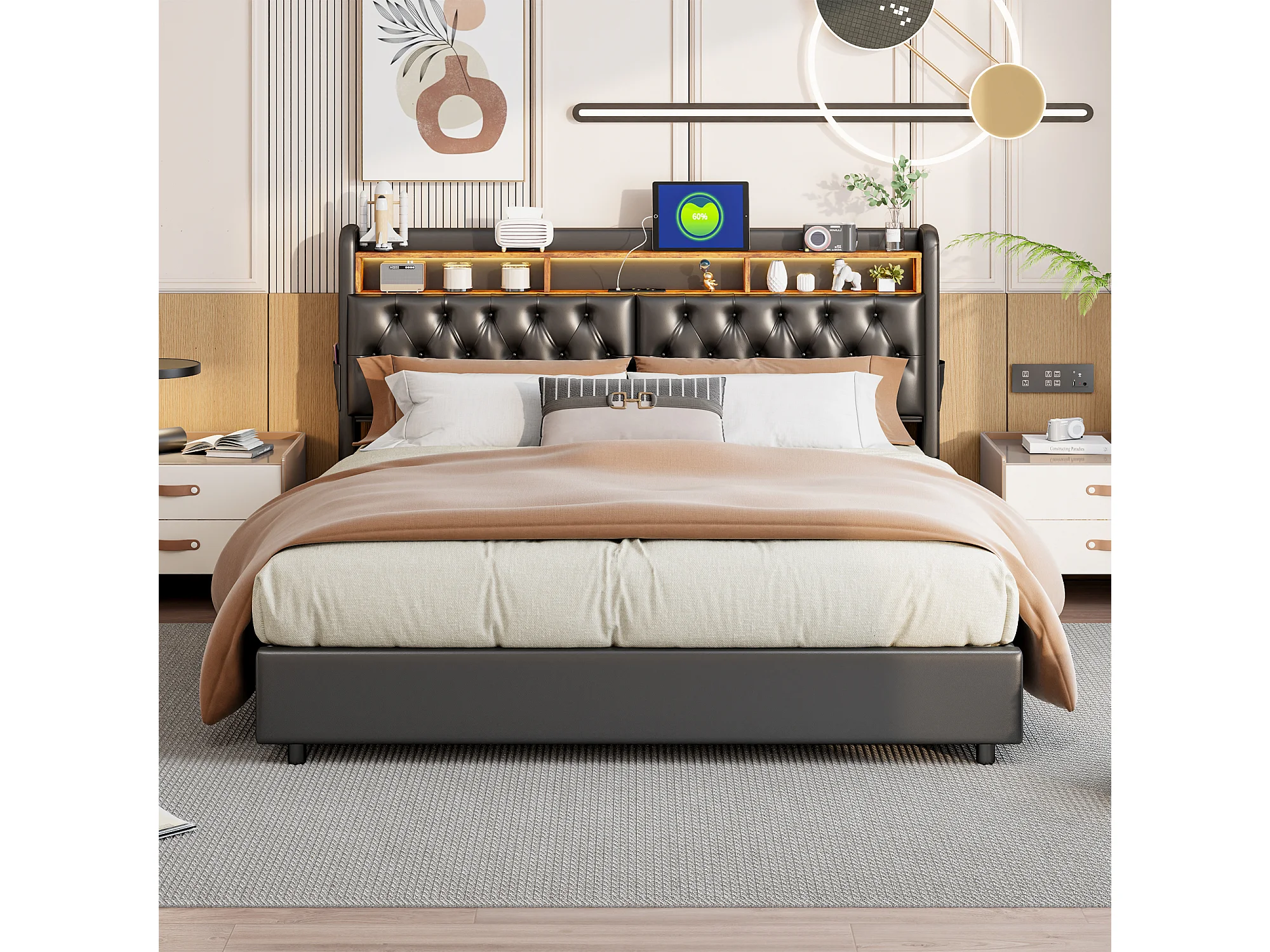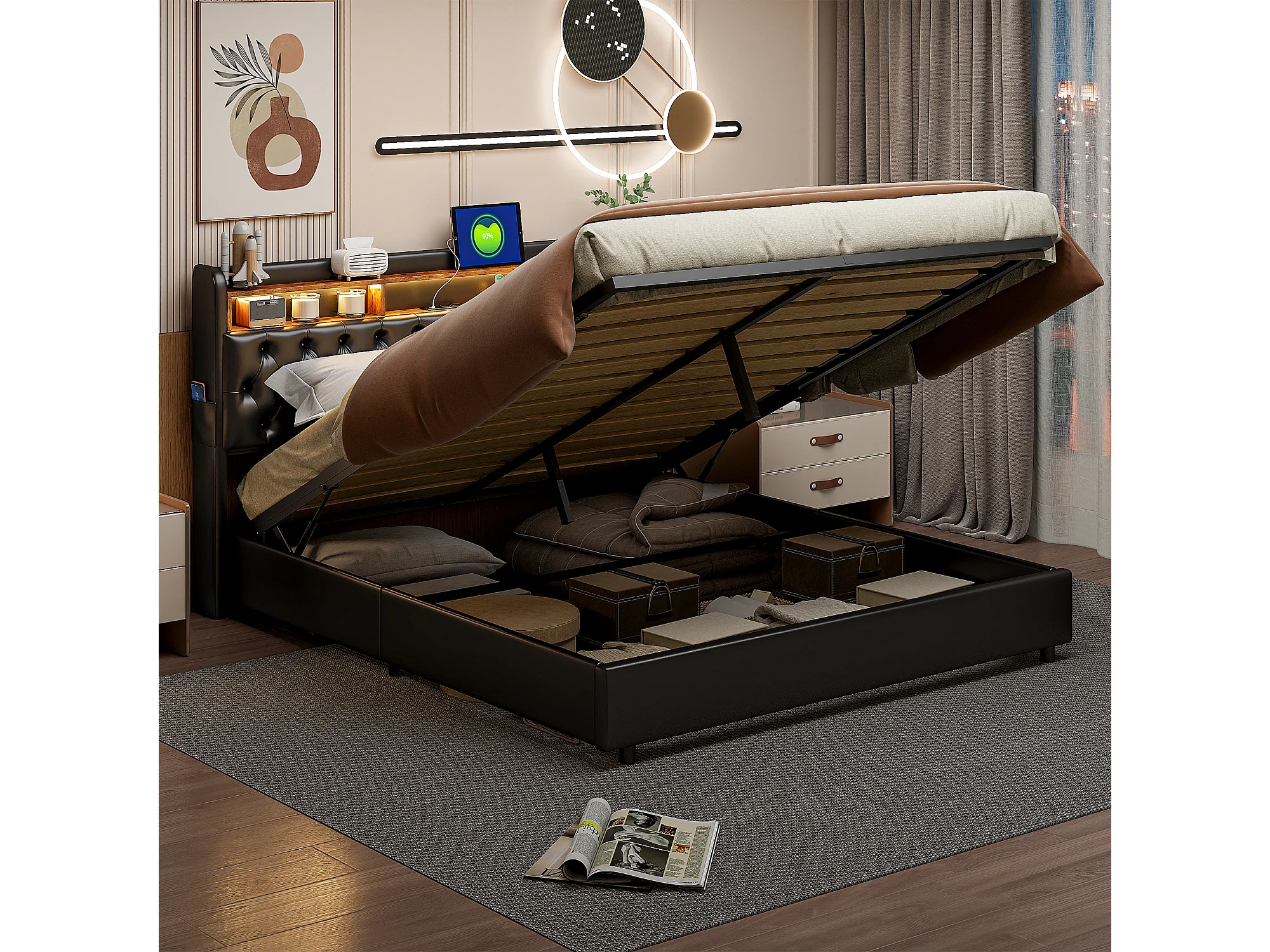 Lit rembourré, lit double, 180 x 200 cm, cadre de lit, lit double, PU, ​​noir, sans matelas