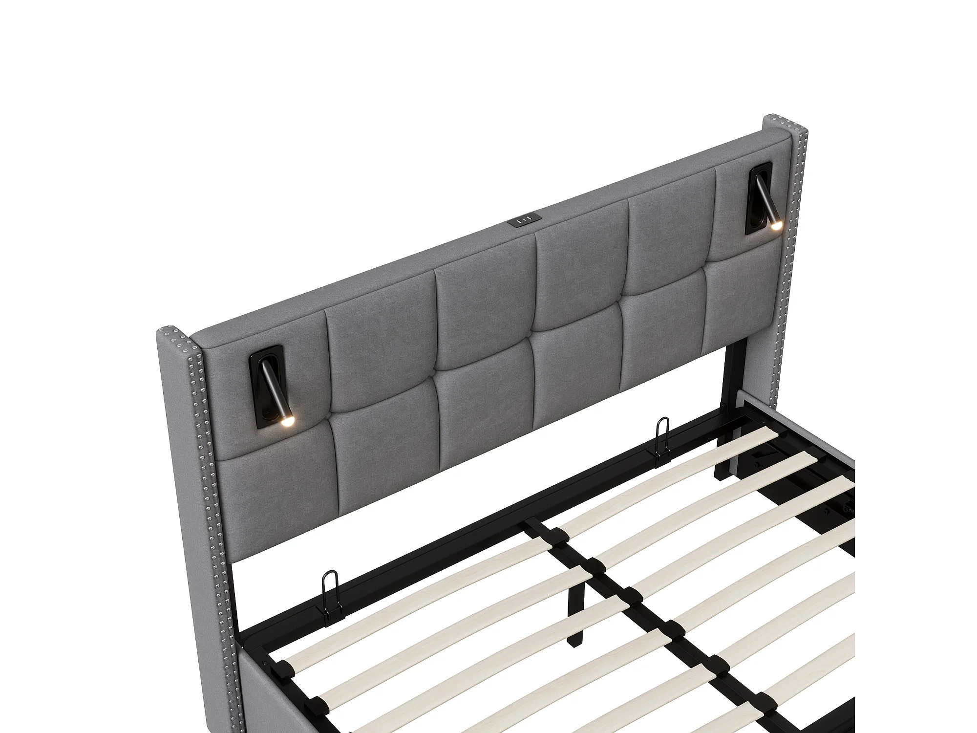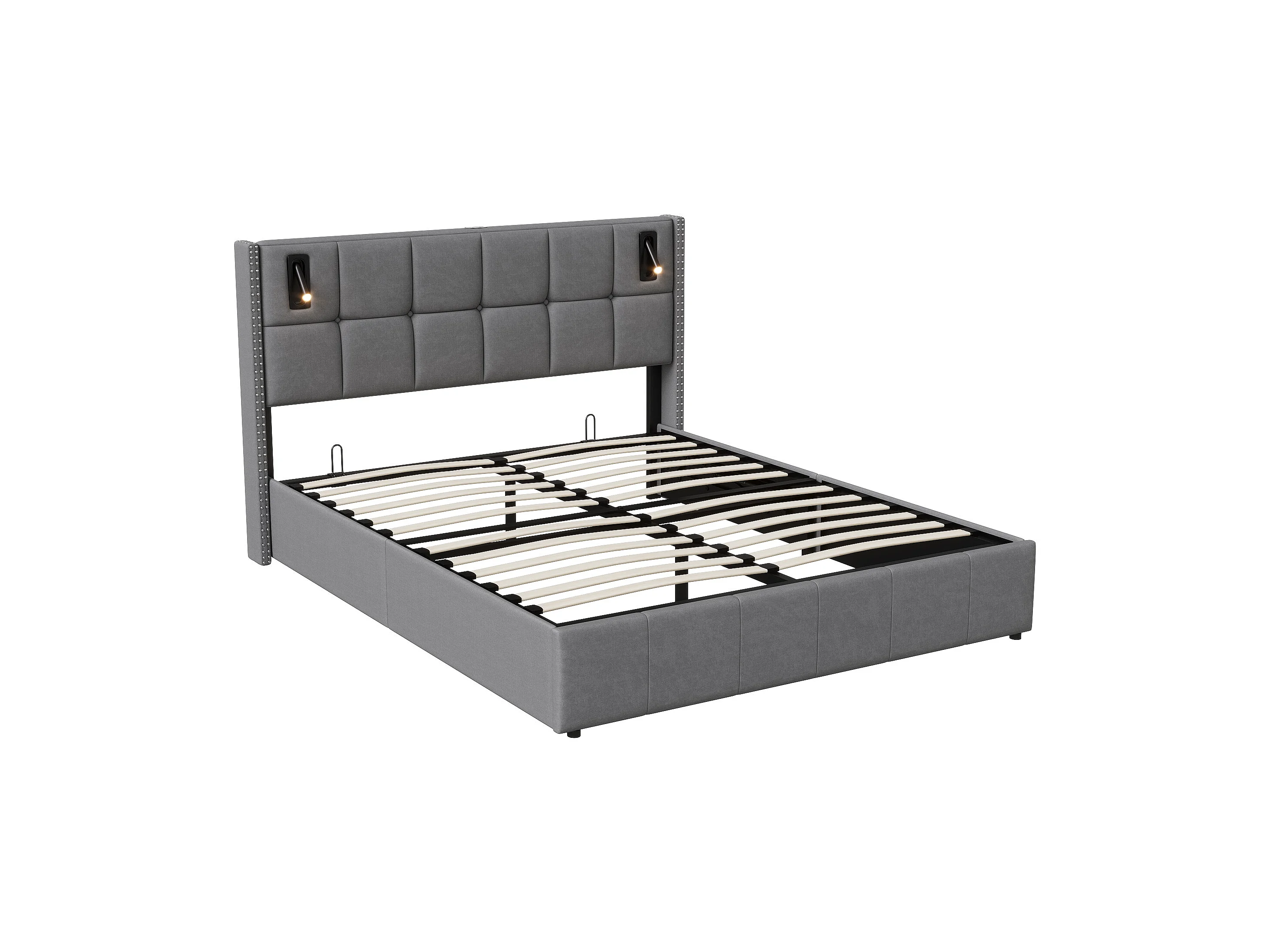 Lit rembourré, lit double, avec lampe de lecture, 160x200cm Lit double, lit coffre, avec espace de rangement, gris, sans matelas