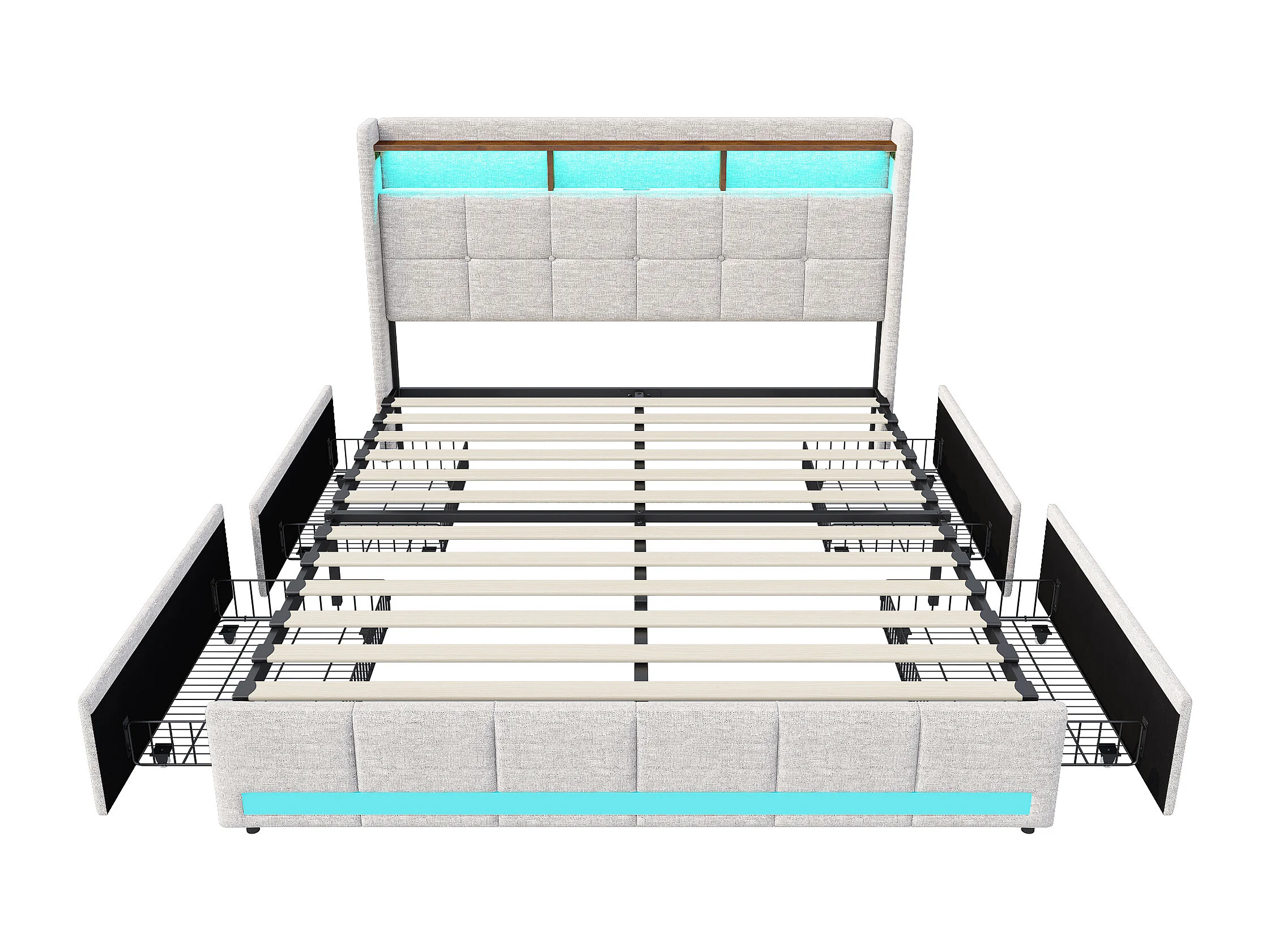Lit Rembourré, Lit Double Rembourré, Lit 140x200cm, Cadre de Lit, Lit Coffre, Lit Double, avec Sommier LED et USB, 4 Tiroirs, avec , Rangement, lin, Beige