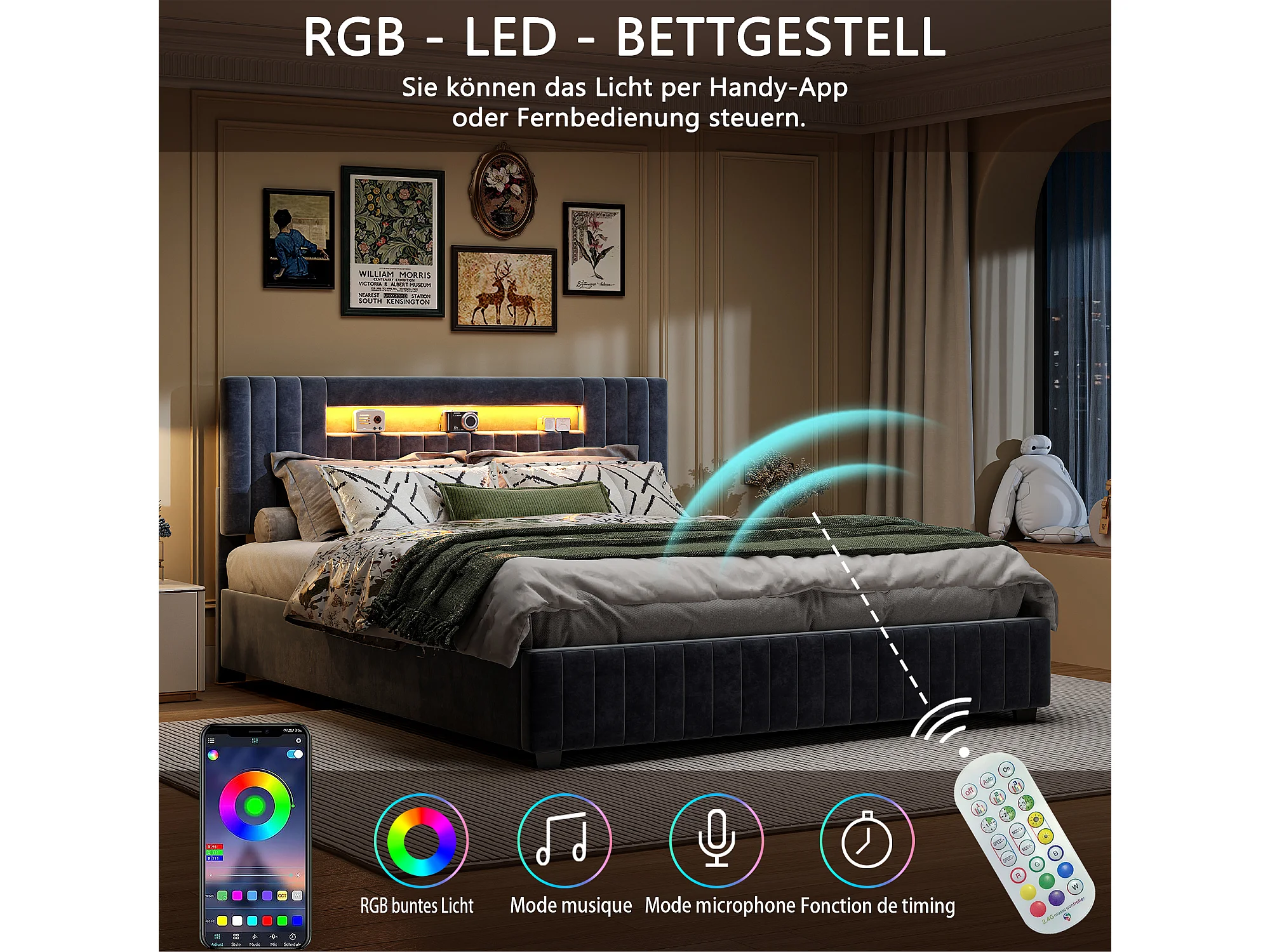 Lit rembourré, lit fonctionnel hydraulique, tête de lit en velours, 160 x 200 cm, lit rembourré, cadre de plate - forme avec rangement pliable, sans matelas