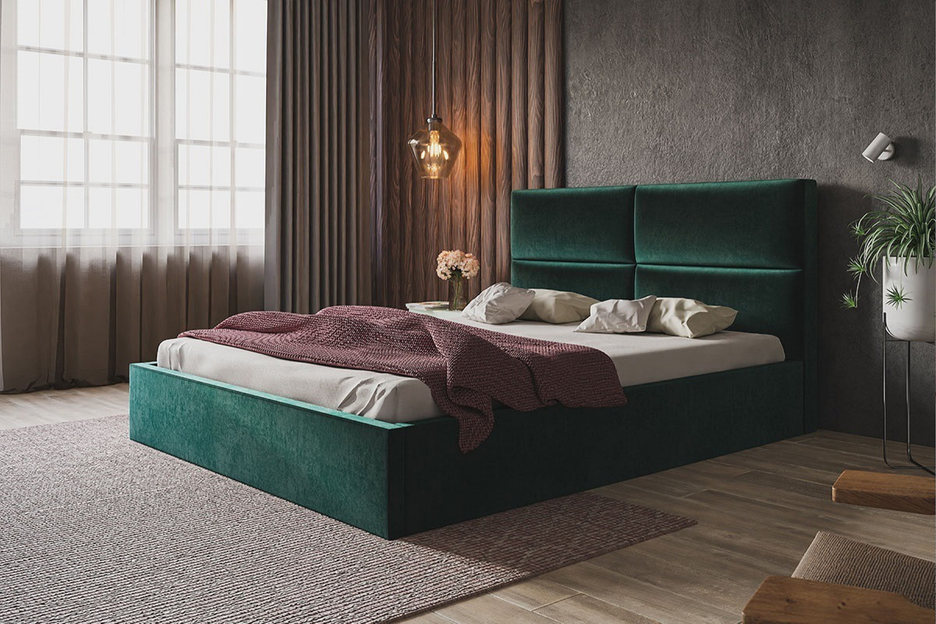 Lit rembourré LIZBONA SLIM avec tête de lit, 120 x 200 cm, lit double avec coffre de rangement et sommier à lattes en bois, couleur : vert, tissu velours