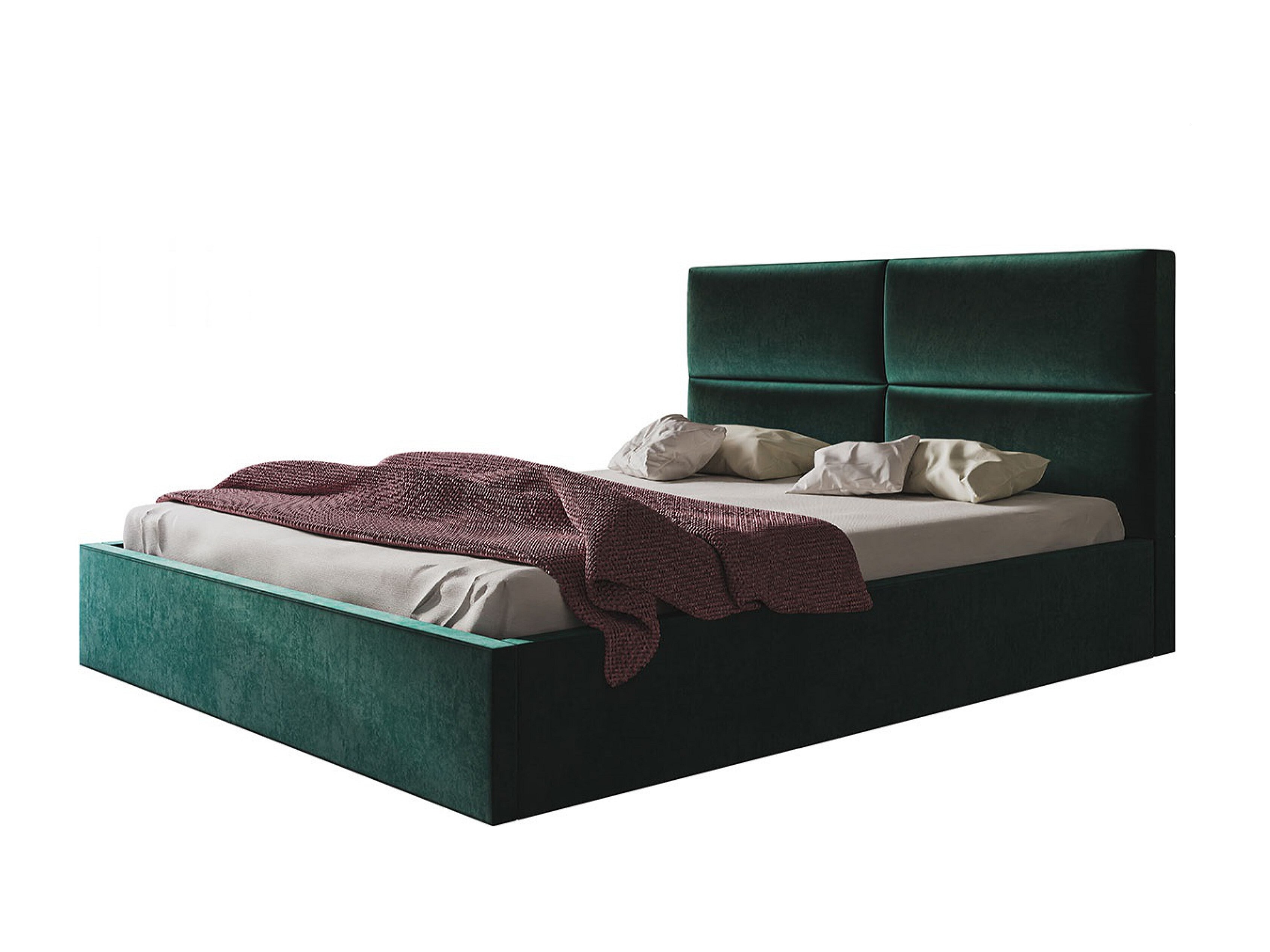 Lit rembourré LIZBONA SLIM avec tête de lit, 160 x 200 cm, lit double avec coffre de rangement et sommier à lattes en bois, couleur : vert, tissu velours