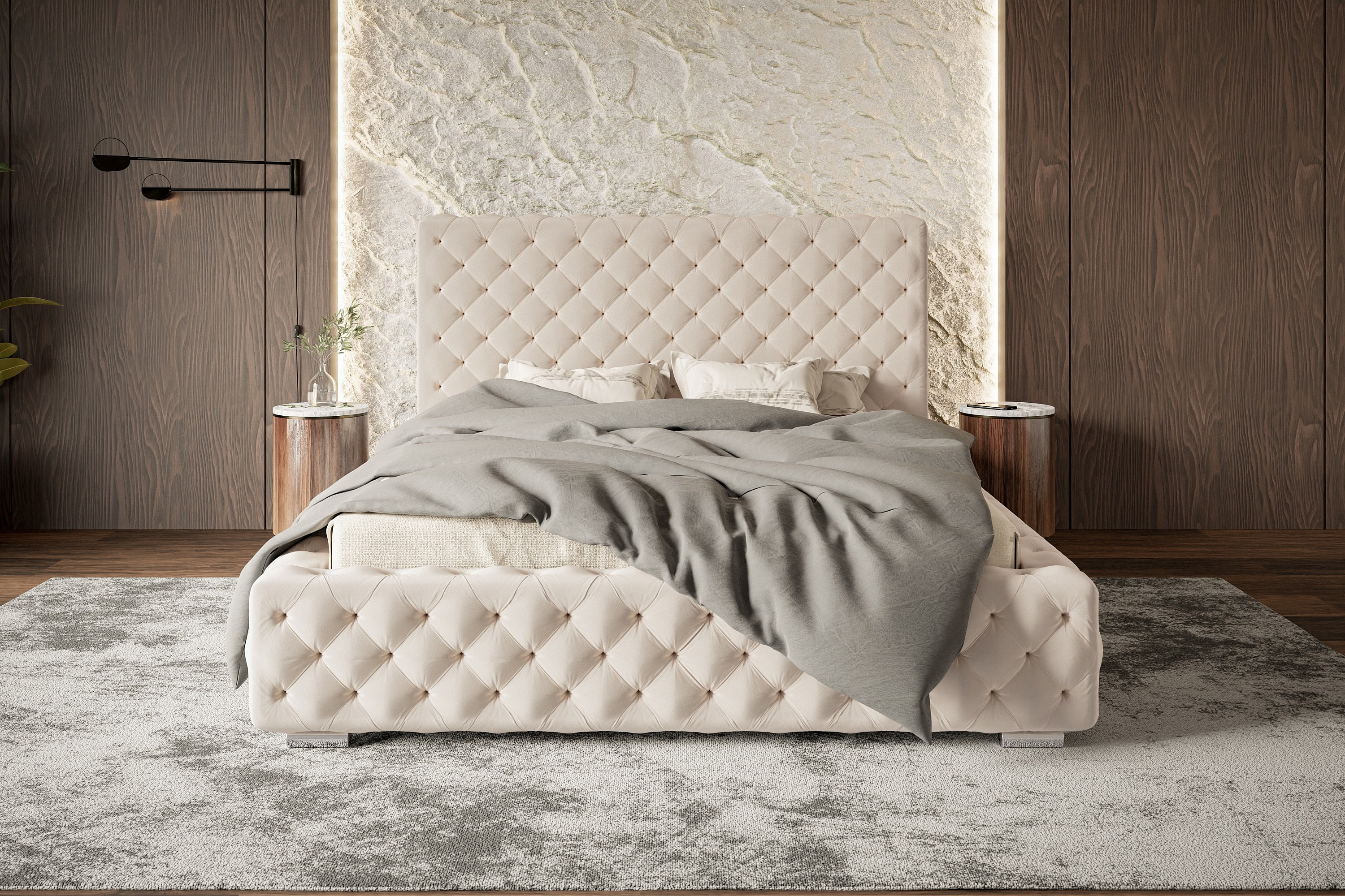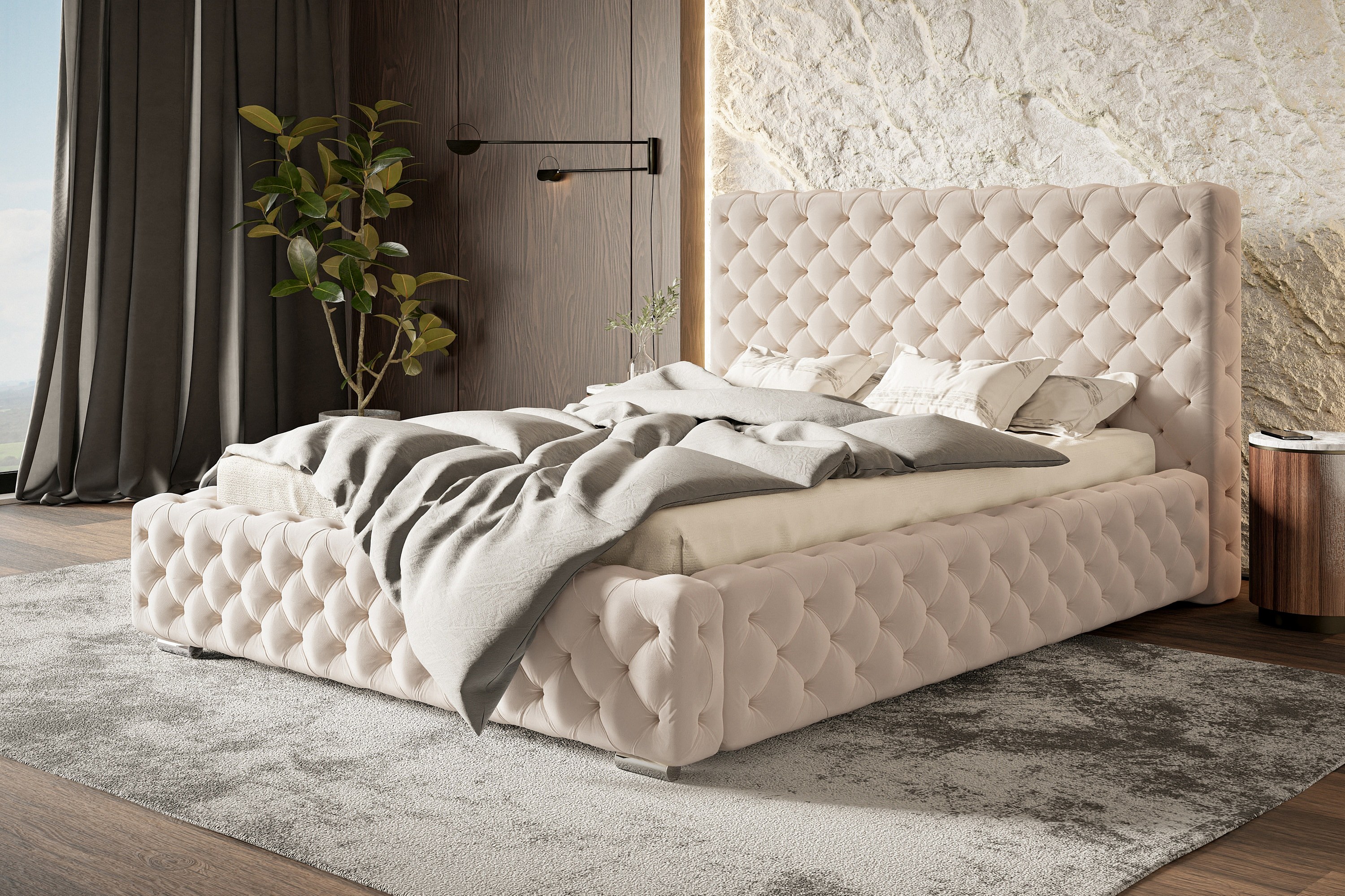 Lit rembourré Miami avec tête de lit, 160x200 cm, lit double avec coffre de rangement et sommier à lattes en bois, tissu velours, couleur : beige