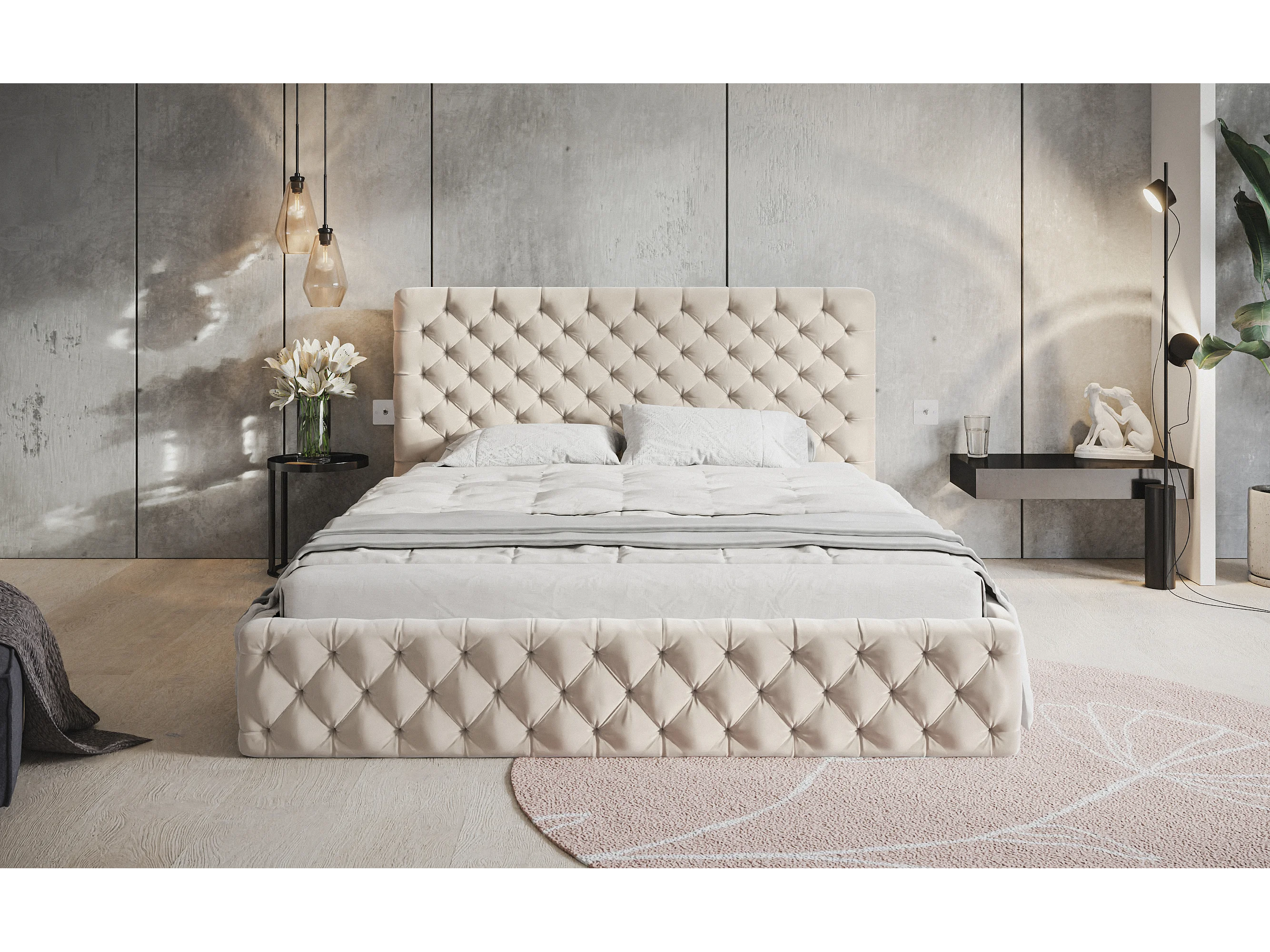Lit rembourré MIAMI SLIM avec tête de lit, 180 x 200 cm, lit double avec coffre de rangement et sommier à lattes en bois, couleur : beige, tissu velours