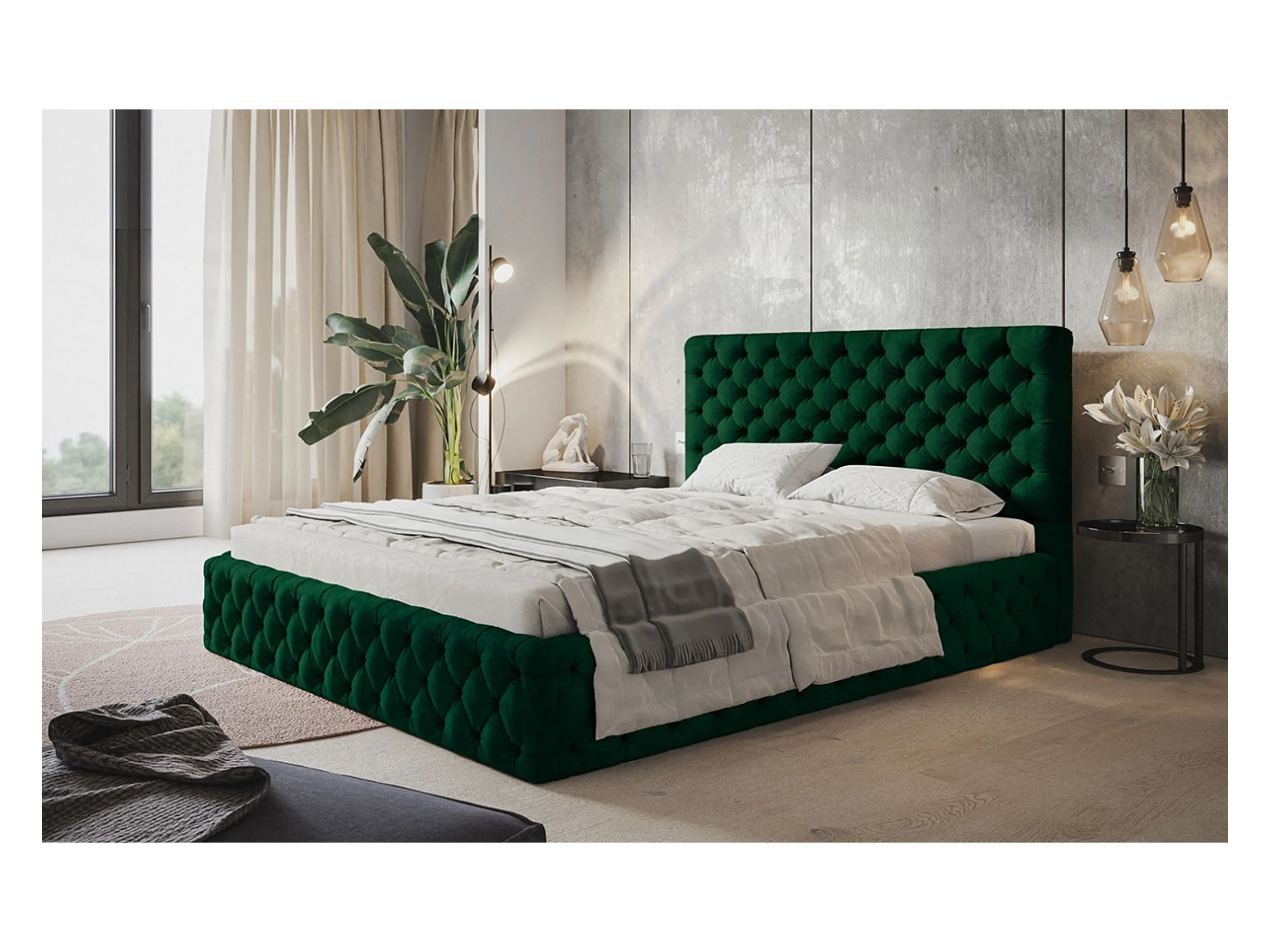 Lit rembourré MIAMI SLIM avec tête de lit, 180 x 200 cm, lit double avec coffre de rangement et sommier à lattes en bois, couleur : vert, tissu velours