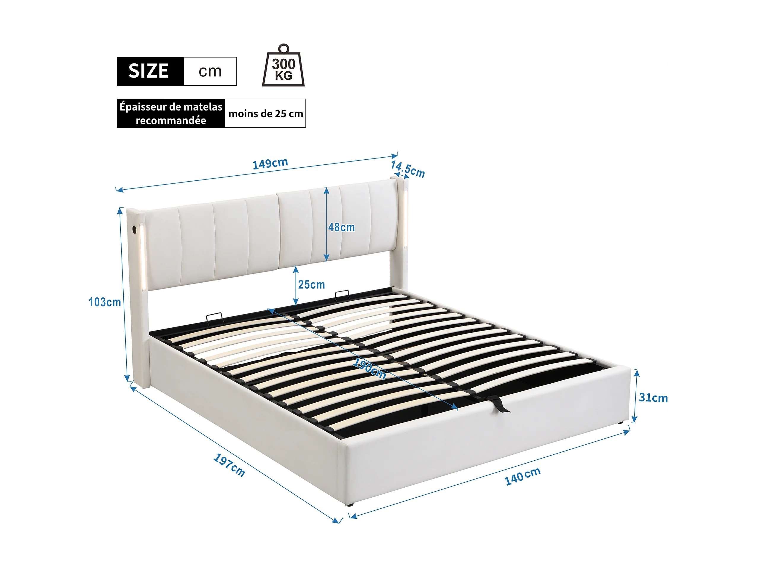 Lit rembourré multifonctionnel 140 x 190 cm, avec éclairage LED, port USB et rangement sous le lit