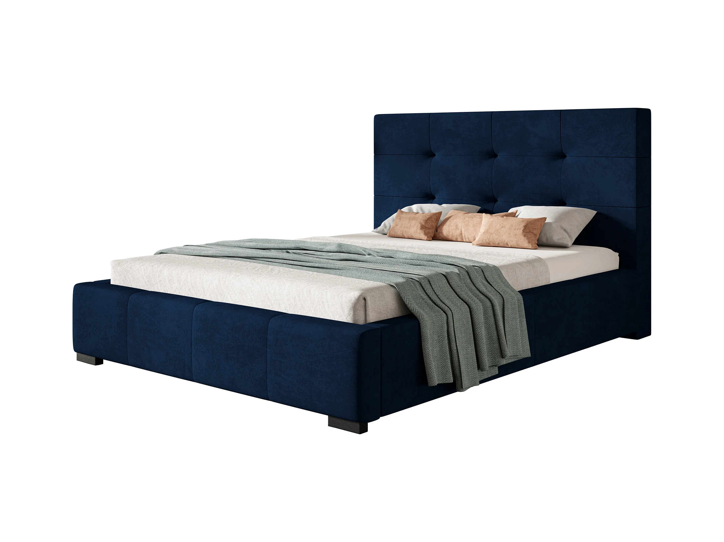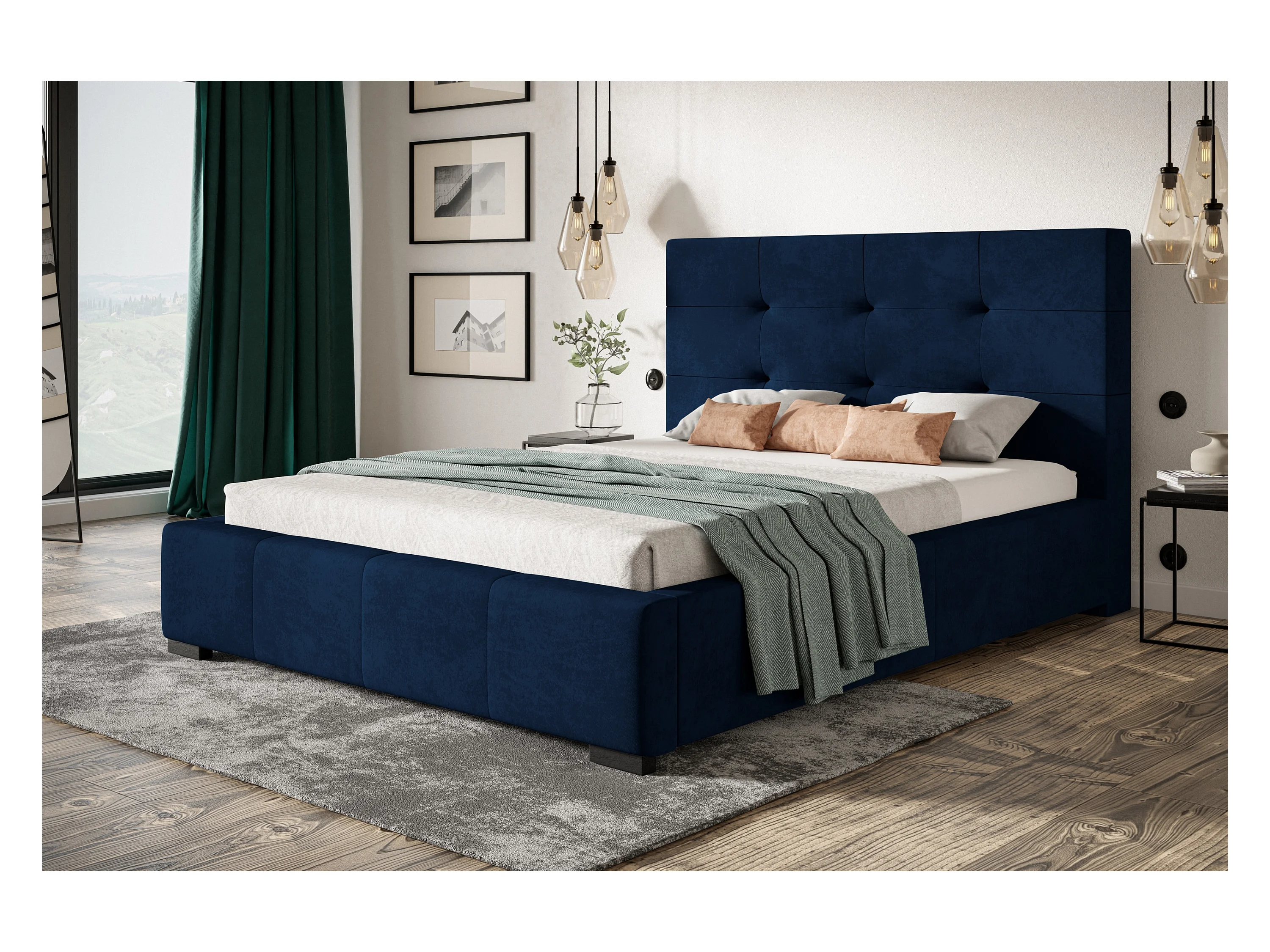 Lit rembourré Oslo avec tête de lit, 160x200 cm, lit double avec coffre de rangement et sommier à lattes en bois, tissu velours, couleur : bleu foncé