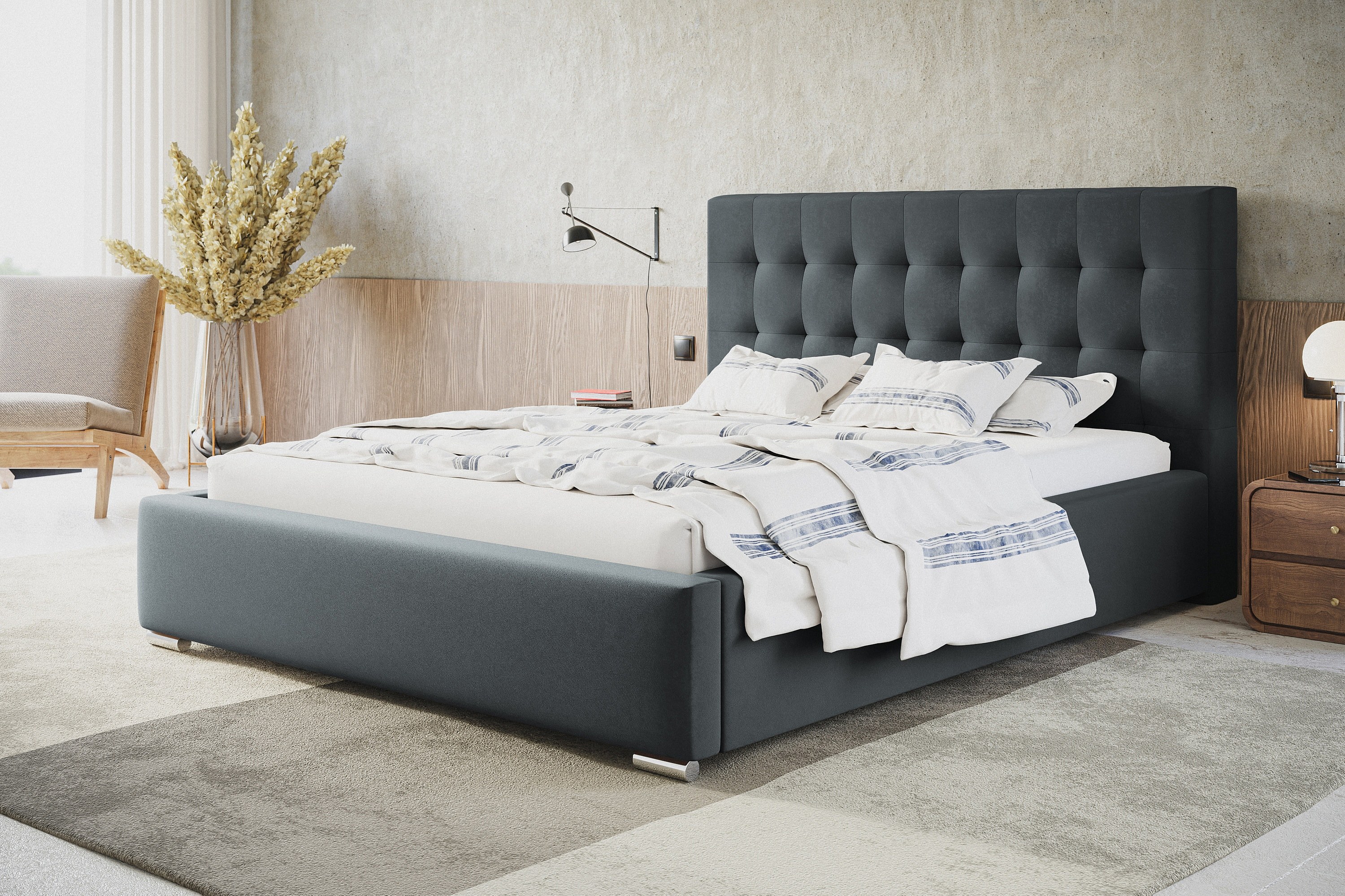 Lit rembourré RIO avec tête de lit, 160x200 cm, lit double avec coffre de rangement et sommier à lattes en bois, tissu velours, couleur : gris foncé
