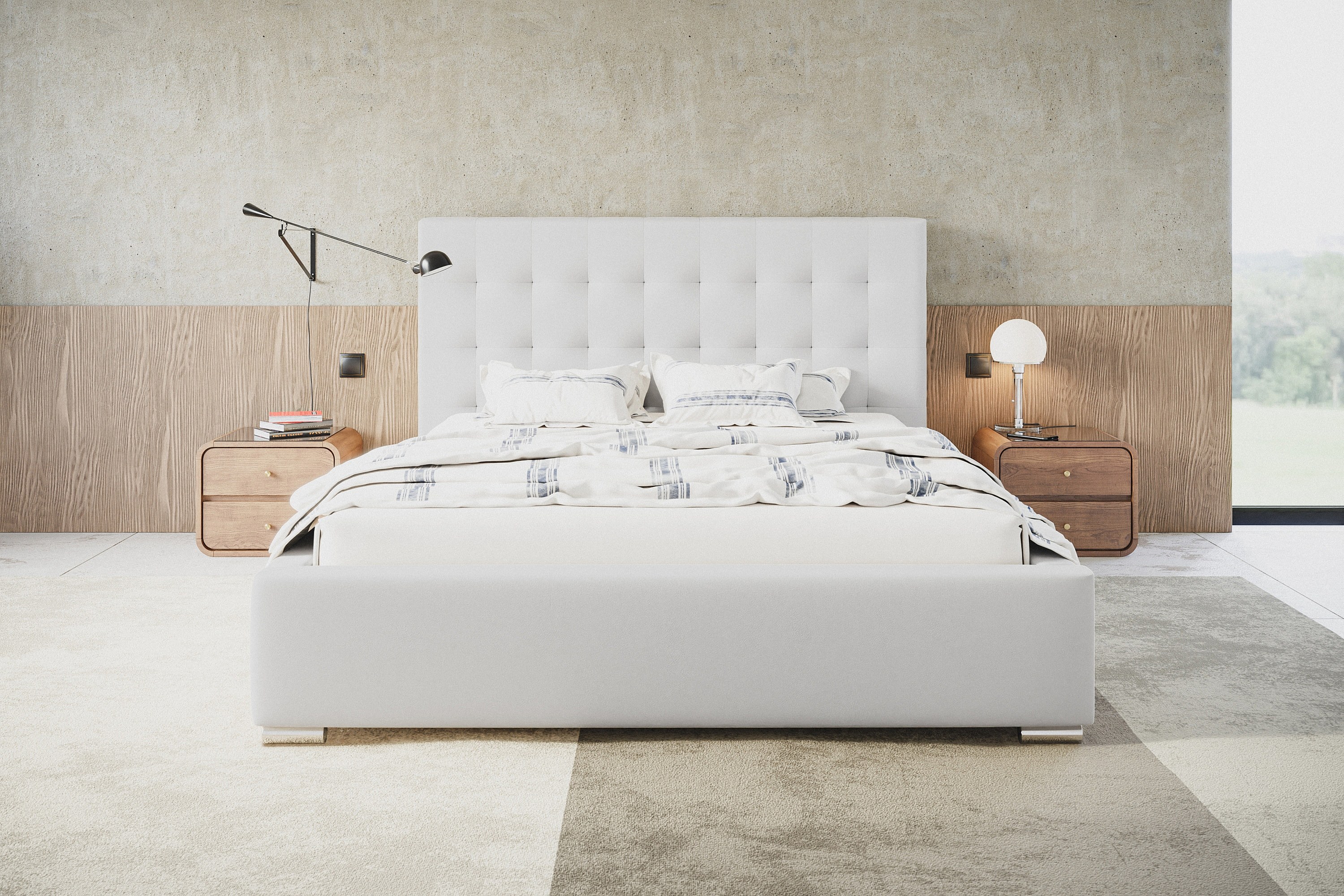 Lit rembourré RIO avec tête de lit, 180x200 cm, lit double avec coffre de rangement et sommier à lattes en bois, similicuir, couleur : blanc