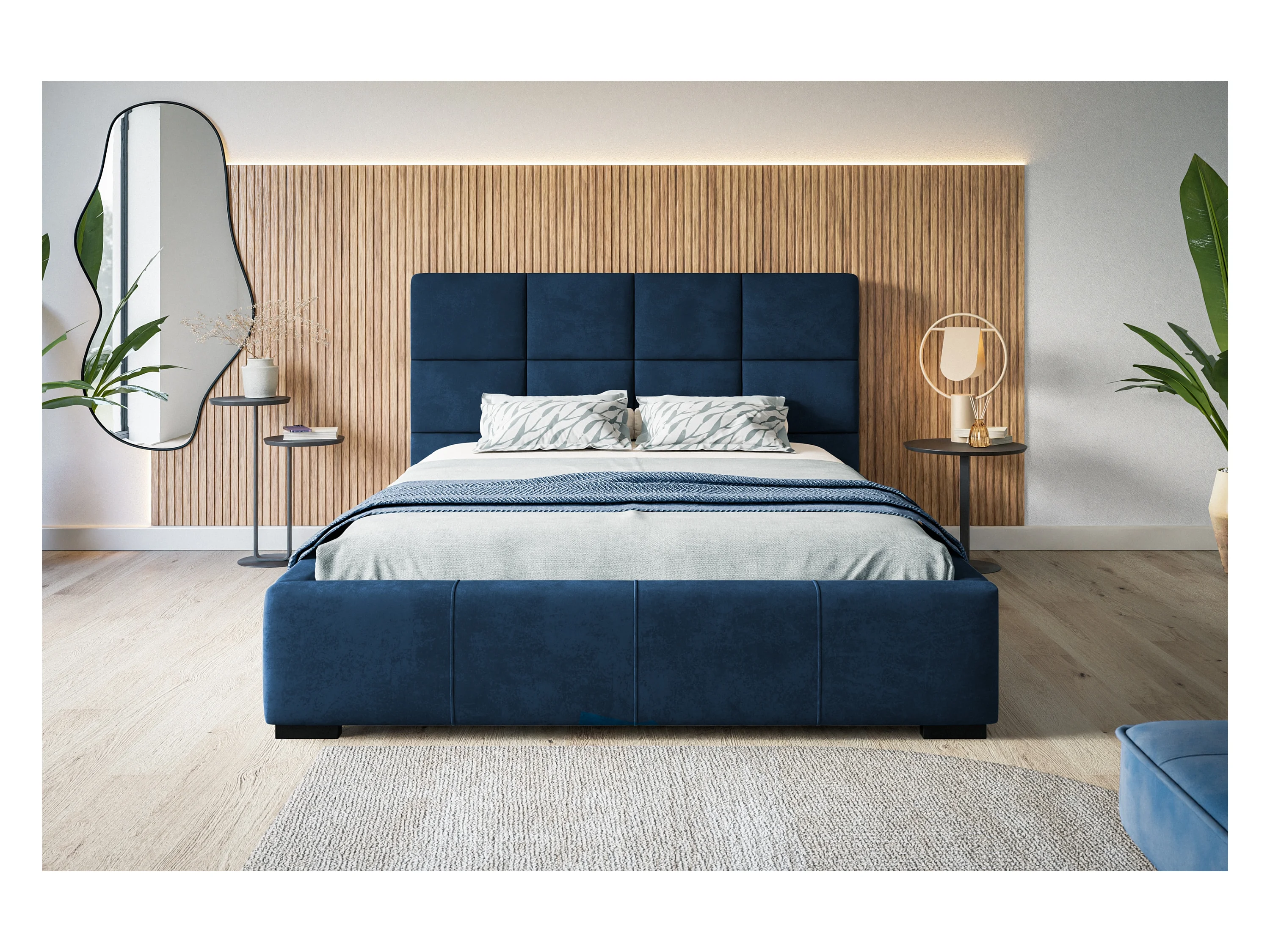 Lit rembourré Rom avec tête de lit, 180x200 cm, lit double avec coffre de rangement et sommier à lattes en bois, tissu velours, couleur : bleu foncé