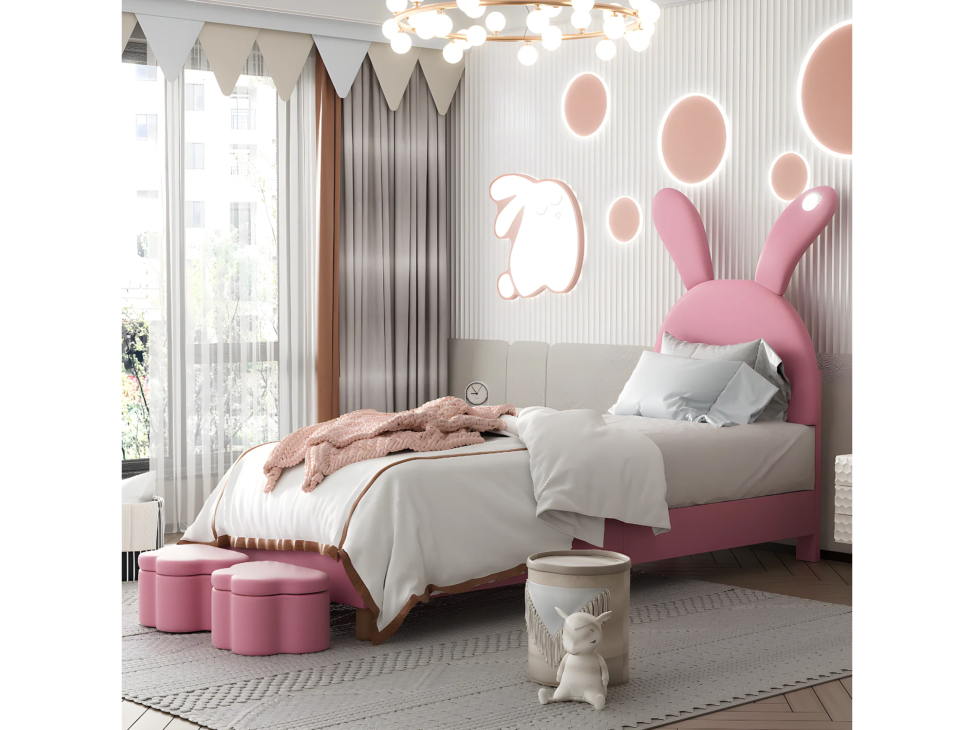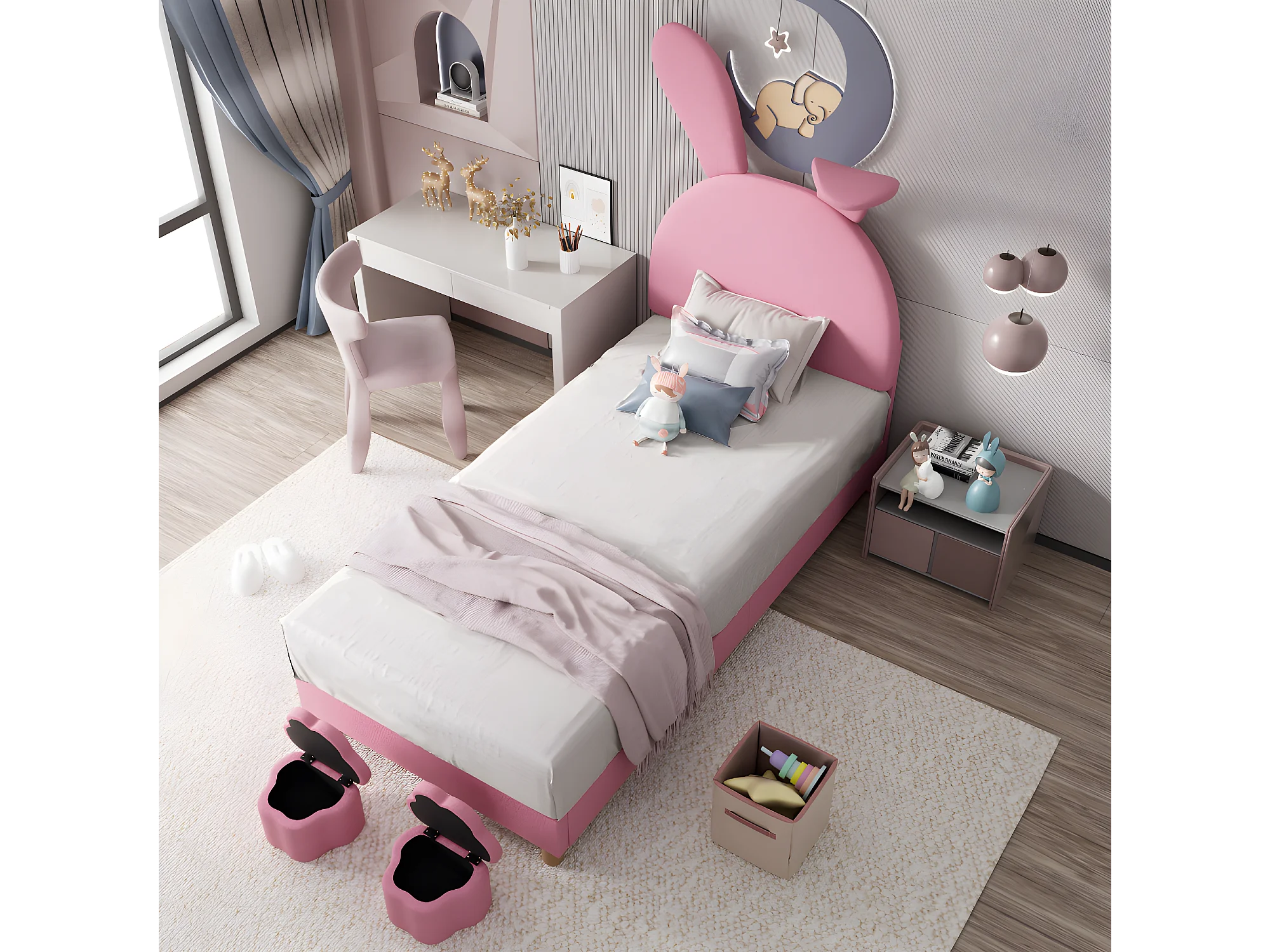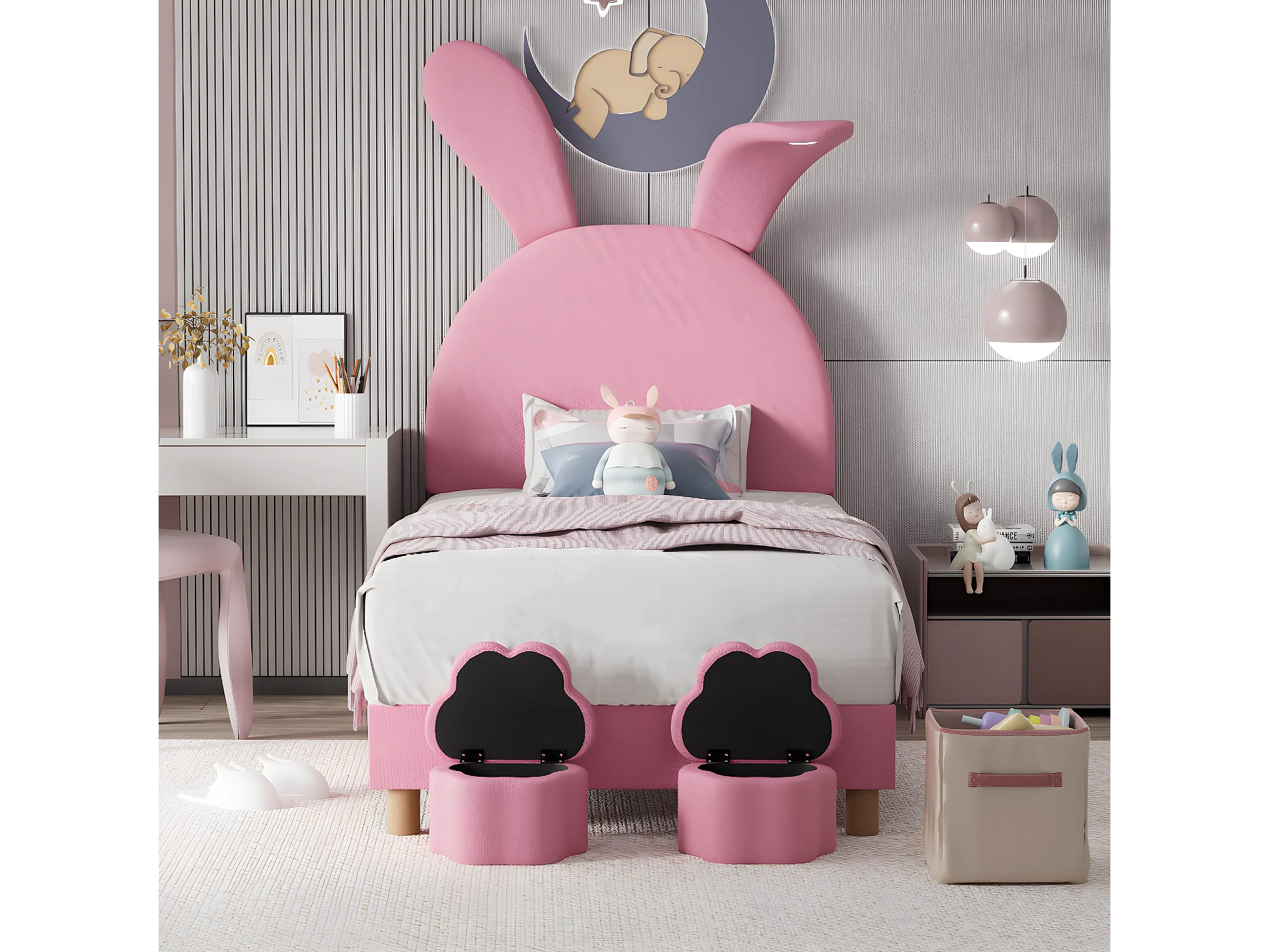 Lit rembourré rose 90x200, velours français avec deux tabourets de rangement, lampe de chevet LED et cadre à lattes, sans matelas